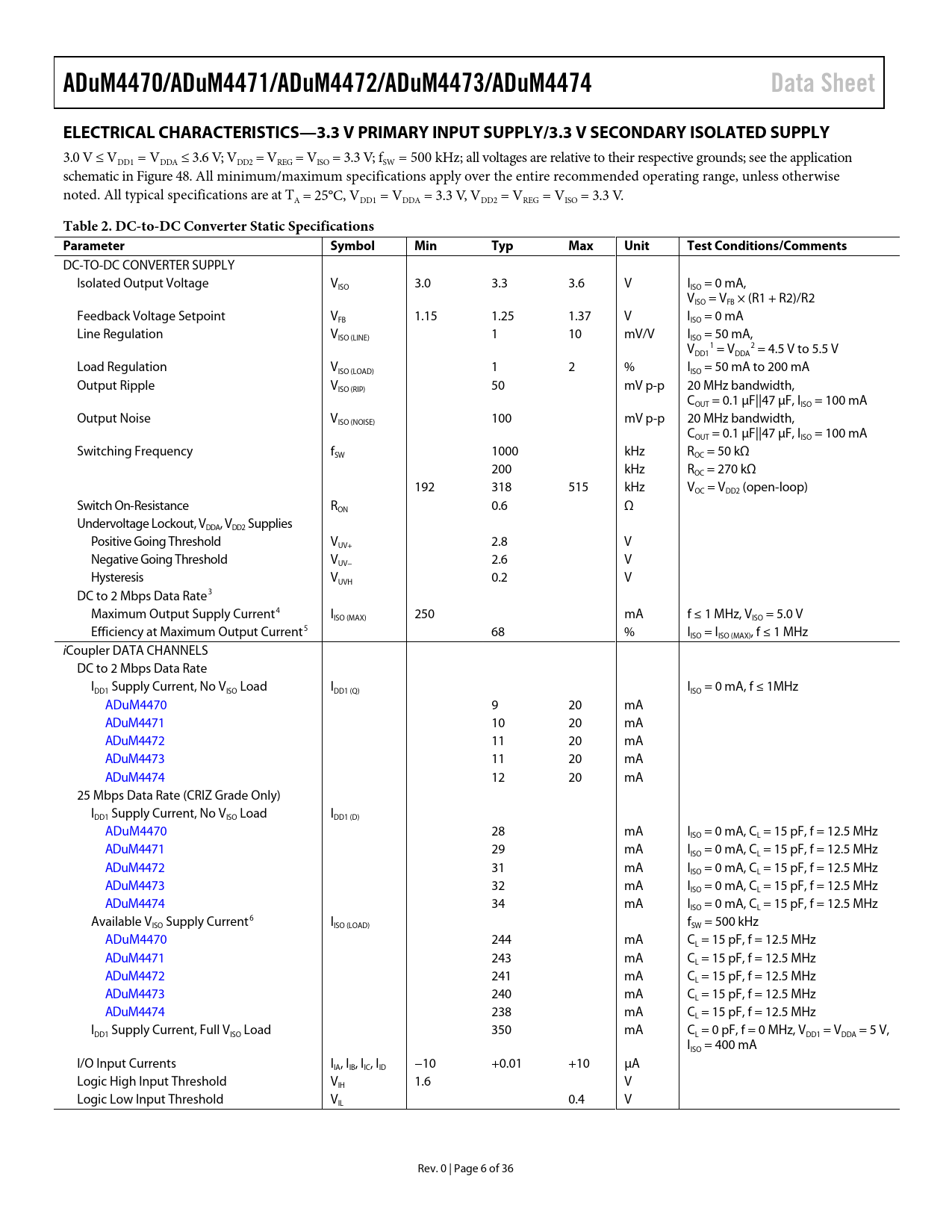ADuM4470/ADuM4471/ADuM4472/ADuM4473/ADuM4474 Data Sheet ELECTRICAL CHARACTERISTICS—3.3 V PRIMARY INPUT SUPPLY/3.3 V SECONDARY ISOLATED SUPPLY
