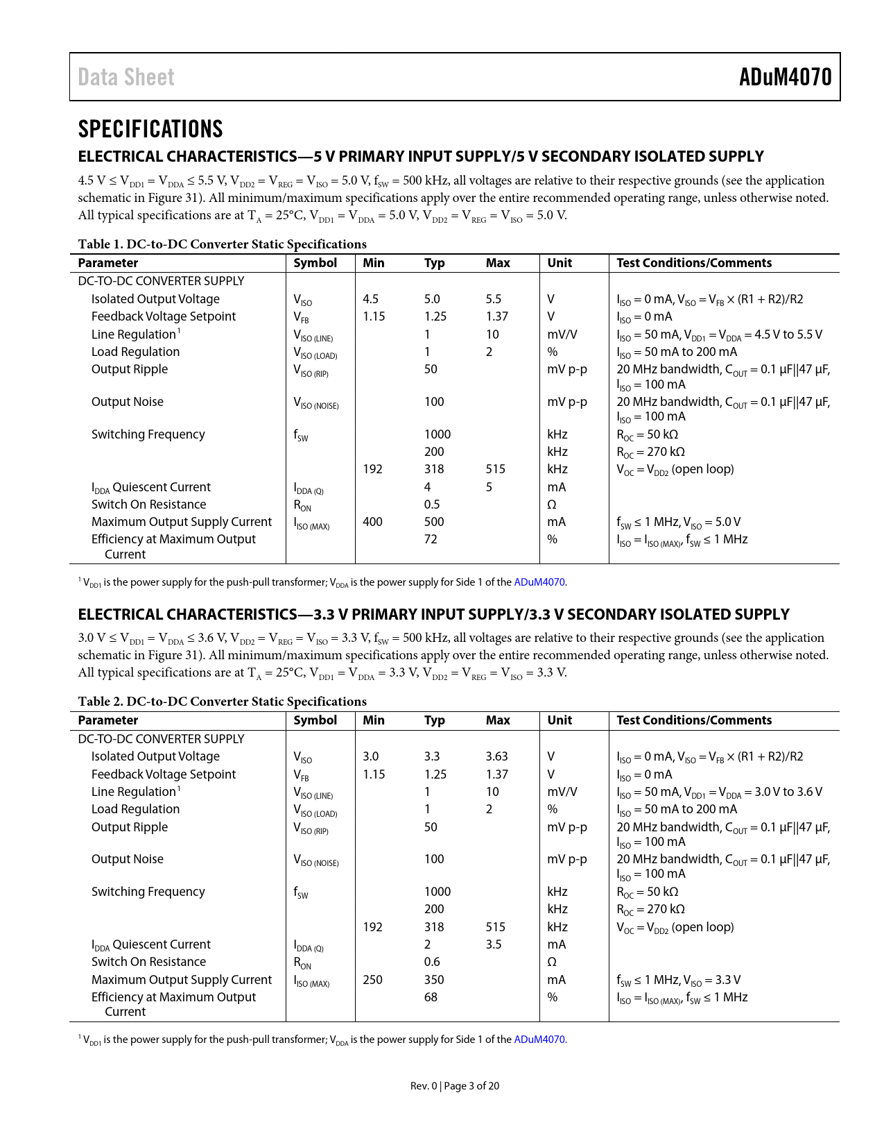 link to page 14 link to page 14 link to page 3 link to page 3 Data SheetADuM4070SPECIFICATIONS ELECTRICAL CHARACTERISTICS—5 V PRIMARY INPUT SUPPLY/5 V SECONDARY ISOLATED SUPPLY 4.5 V ≤ VDD1 = VDDA ≤ 5.5 V, VDD2 = VREG = VISO = 5.0 V, fSW = 500 kHz, al voltages are relative to their respective grounds (see the application schematic in Figure 31). Al minimum/maximum specifications apply over the entire recommended operating range, unless otherwise noted. All typical specifications are at TA = 25°C, VDD1 = VDDA = 5.0 V, VDD2 = VREG = VISO = 5.0 V. Table 1. DC-to-DC Converter Static Specifications ParameterSymbolMinTypMaxUnitTest Conditions/Comments DC-TO-DC CONVERTER SUPPLY Isolated Output Voltage V 4.5 5.0 5.5 V I = 0 mA, V = V × (R1 + R2)/R2 ISO ISO ISO FB Feedback Voltage Setpoint V 1.15 1.25 1.37 V I = 0 mA FB ISO Line Regulation1 V 1 10 mV/V I = 50 mA, V = V = 4.5 V to 5.5 V ISO (LINE) ISO DD1 DDA Load Regulation V 1 2 % I = 50 mA to 200 mA ISO (LOAD) ISO Output Ripple V 50 mV p-p 20 MHz bandwidth, C = 0.1 µF||47 µF, ISO (RIP) OUT I = 100 mA ISO Output Noise V 100 mV p-p 20 MHz bandwidth, C = 0.1 µF||47 µF, ISO (NOISE) OUT I = 100 mA ISO Switching Frequency f 1000 kHz R = 50 kΩ SW OC 200 kHz R = 270 kΩ OC 192 318 515 kHz V = V (open loop) OC DD2 I Quiescent Current I 4 5 mA DDA DDA (Q) Switch On Resistance R 0.5 Ω ON Maximum Output Supply Current I 400 500 mA f ≤ 1 MHz, V = 5.0 V ISO (MAX) SW ISO Efficiency at Maximum Output 72 % I = I , f ≤ 1 MHz ISO ISO (MAX) SW Current 1 VDD1 is the power supply for the push-pull transformer; VDDA is the power supply for Side 1 of the ADuM4070. ELECTRICAL CHARACTERISTICS—3.3 V PRIMARY INPUT SUPPLY/3.3 V SECONDARY ISOLATED SUPPLY 3.0 V ≤ VDD1 = VDDA ≤ 3.6 V, VDD2 = VREG = VISO = 3.3 V, fSW = 500 kHz, al voltages are relative to their respective grounds (see the application schematic in Figure 31). Al minimum/maximum specifications apply over the entire recommended operating range, unless otherwise noted. All typical specifications are at TA = 25°C, VDD1 = VDDA = 3.3 V, VDD2 = VREG = VISO = 3.3 V. Table 2. DC-to-DC Converter Static Specifications ParameterSymbolMinTypMaxUnitTest Conditions/Comments DC-TO-DC CONVERTER SUPPLY Isolated Output Voltage V 3.0 3.3 3.63 V I = 0 mA, V = V × (R1 + R2)/R2 ISO ISO ISO FB Feedback Voltage Setpoint V 1.15 1.25 1.37 V I = 0 mA FB ISO Line Regulation1 V 1 10 mV/V I = 50 mA, V = V = 3.0 V to 3.6 V ISO (LINE) ISO DD1 DDA Load Regulation V 1 2 % I = 50 mA to 200 mA ISO (LOAD) ISO Output Ripple V 50 mV p-p 20 MHz bandwidth, C = 0.1 µF||47 µF, ISO (RIP) OUT I = 100 mA ISO Output Noise V 100 mV p-p 20 MHz bandwidth, C = 0.1 µF||47 µF, ISO (NOISE) OUT I = 100 mA ISO Switching Frequency f 1000 kHz R = 50 kΩ SW OC 200 kHz R = 270 kΩ OC 192 318 515 kHz V = V (open loop) OC DD2 I Quiescent Current I 2 3.5 mA DDA DDA (Q) Switch On Resistance R 0.6 Ω ON Maximum Output Supply Current I 250 350 mA f ≤ 1 MHz, V = 3.3 V ISO (MAX) SW ISO Efficiency at Maximum Output 68 % I = I , f ≤ 1 MHz ISO ISO (MAX) SW Current 1 VDD1 is the power supply for the push-pull transformer; VDDA is the power supply for Side 1 of the ADuM4070. Rev. 0 | Page 3 of 20 Document Outline Features Applications Functional Block Diagram General Description Table of Contents Revision History Specifications Electrical Characteristics—5 V Primary Input Supply/5 V Secondary Isolated Supply Electrical Characteristics—3.3 V Primary Input Supply/3.3 V Secondary Isolated Supply Electrical Characteristics—5 V Primary Input Supply/3.3 V Secondary Isolated Supply Electrical Characteristics—5 V Primary Input Supply/15 V Secondary Isolated Supply Package Characteristics Regulatory Approvals (Pending) Insulation and Safety-Related Specifications DIN V VDE V 0884-10 (VDE V 0884-10):2006-12 Insulation Characteristics Recommended Operating Conditions Absolute Maximum Ratings ESD Caution Pin Configuration and Function Descriptions Typical Performance Characteristics Applications Information Application Schematics Transformer Design Transformer Turns Ratio Transformer ET Constant Transformer Primary Inductance and Resistance Transformer Isolation Voltage Switching Frequency Transient Response Component Selection Printed Circuit Board (PCB) Layout Thermal Analysis Power Consumption Power Considerations Soft Start Mode and Current-Limit Protection Insulation Lifetime Outline Dimensions Ordering Guide