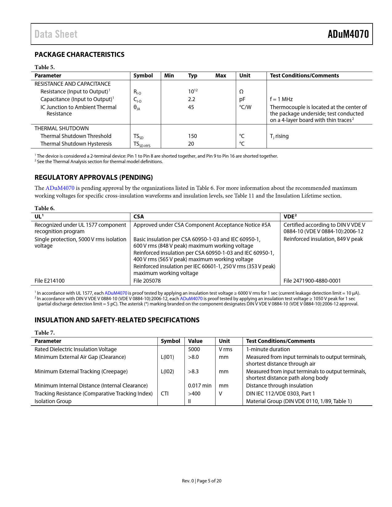 Data Sheet. ADuM4070. PACKAGE CHARACTERISTICS. Table 5. Parameter. Symbol. Min. Typ. Max. Unit. Test Conditions/Comments