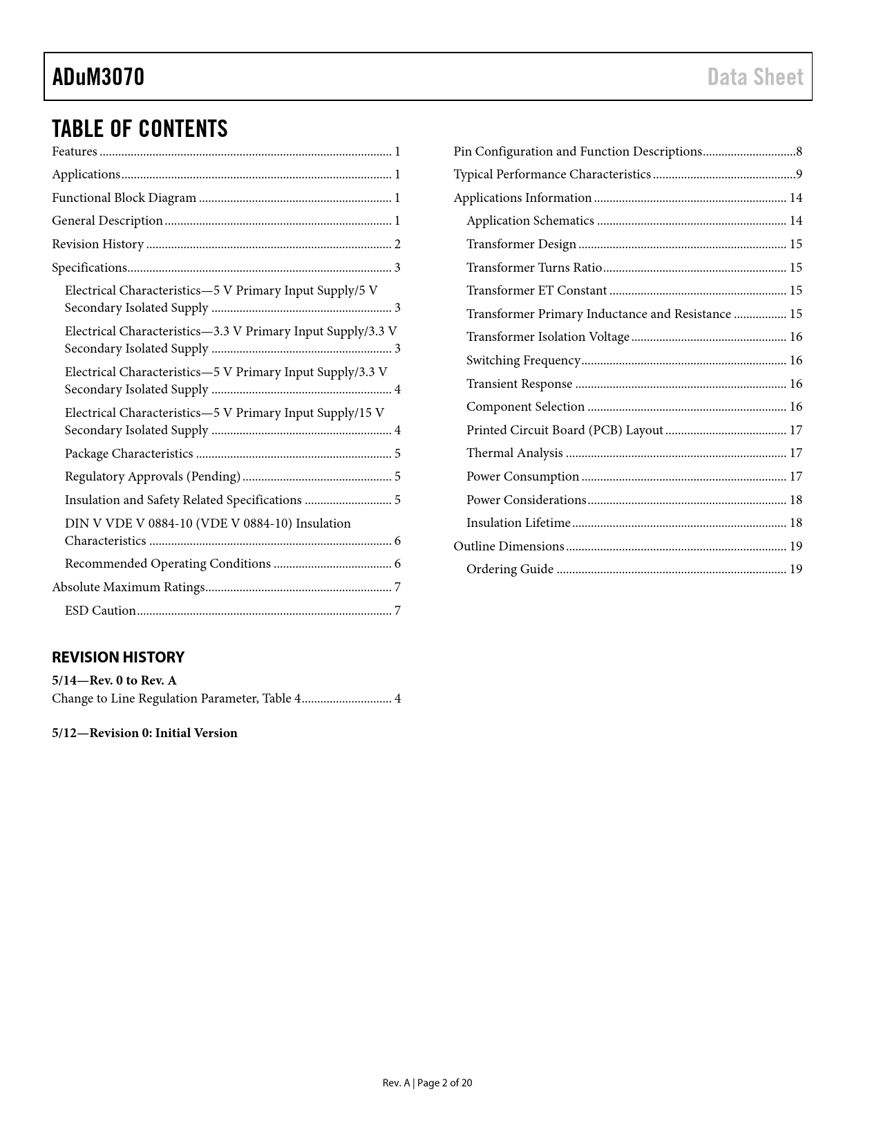 ADuM3070 Data Sheet TABLE OF CONTENTS REVISION HISTORY 5/14—Rev 0 to Rev A 5/12—Revision 0: Initial Version