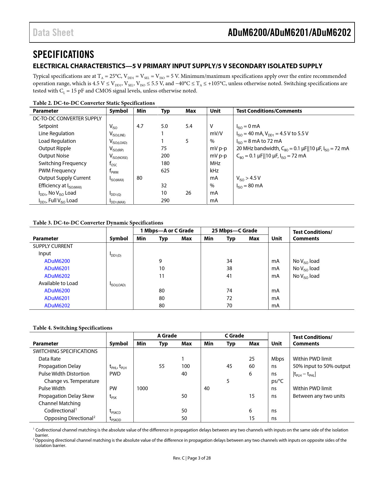 Data Sheet ADuM6200/ADuM6201/ADuM6202 SPECIFICATIONS ELECTRICAL CHARACTERISTICS—5 V PRIMARY INPUT SUPPLY/5 V SECONDARY ISOLATED SUPPLY
