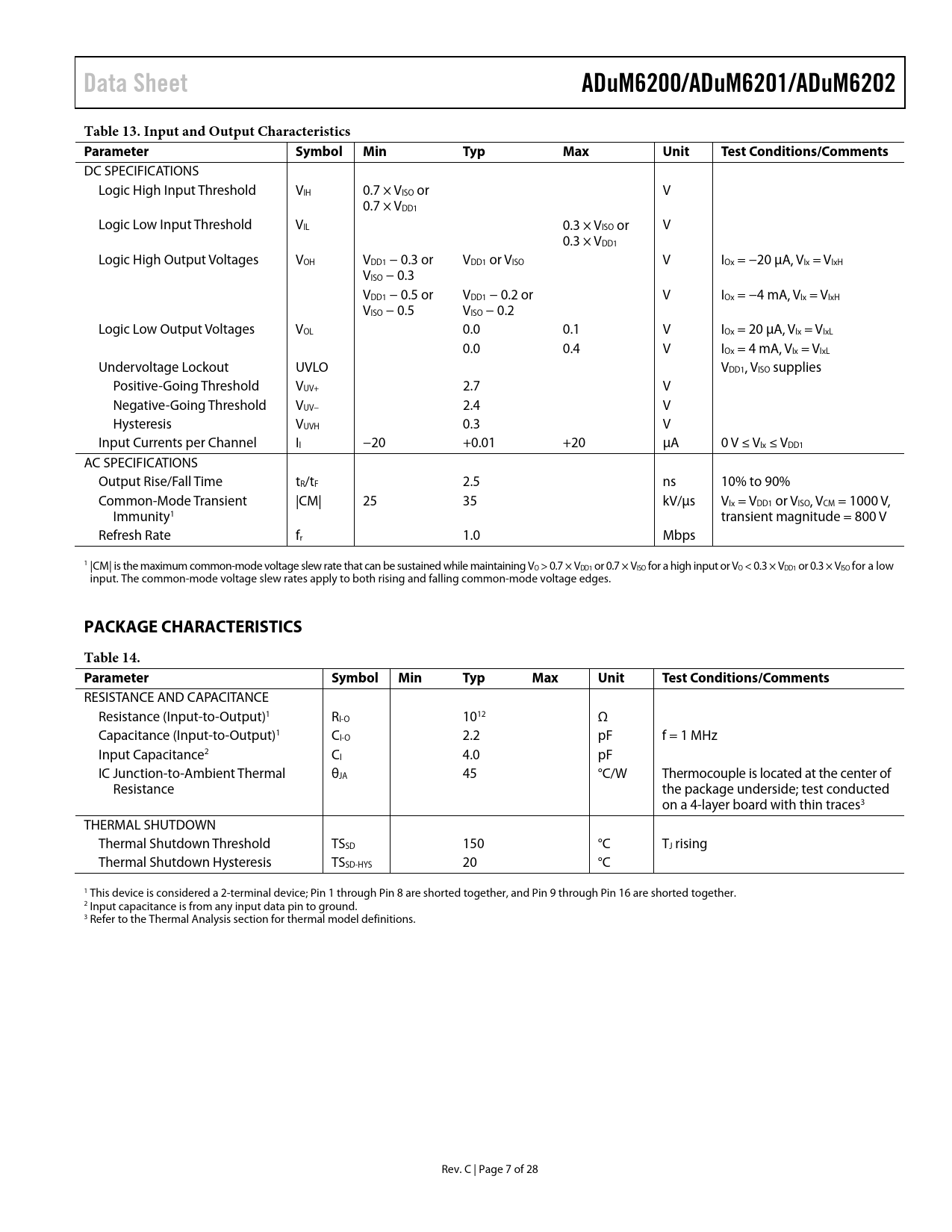 Data Sheet. ADuM6200/ADuM6201/ADuM6202. Table 13. Input and Output Characteristics Parameter Symbol. Min. Typ. Max. Unit. Test