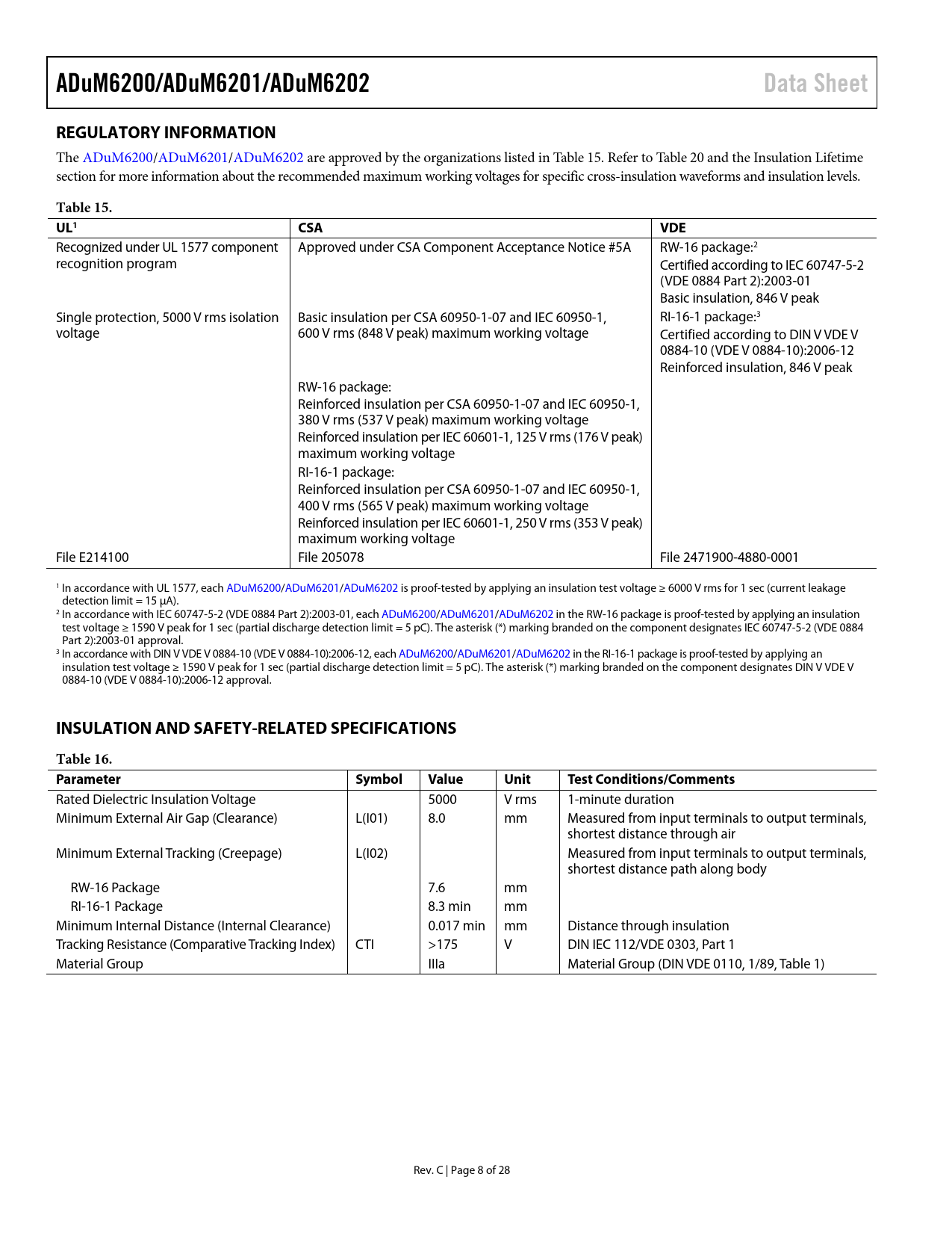link to page 8 link to page 10 link to page 23 link to page 8 link to page 8 link to page 8 ADuM6200/ADuM6201/ADuM6202Data SheetREGULATORY INFORMATION The ADuM6200/ADuM6201/ADuM6202 are approved by the organizations listed in Table 15. Refer to Table 20 and the Insulation Lifetime section for more information about the recommended maximum working voltages for specific cross-insulation waveforms and insulation levels. Table 15. UL1 CSAVDE Recognized under UL 1577 component Approved under CSA Component Acceptance Notice #5A RW-16 package:2 recognition program Certified according to IEC 60747-5-2 (VDE 0884 Part 2):2003-01 Basic insulation, 846 V peak Single protection, 5000 V rms isolation Basic insulation per CSA 60950-1-07 and IEC 60950-1, RI-16-1 package:3 voltage 600 V rms (848 V peak) maximum working voltage Certified according to DIN V VDE V 0884-10 (VDE V 0884-10):2006-12 Reinforced insulation, 846 V peak RW-16 package: Reinforced insulation per CSA 60950-1-07 and IEC 60950-1, 380 V rms (537 V peak) maximum working voltage Reinforced insulation per IEC 60601-1, 125 V rms (176 V peak) maximum working voltage RI-16-1 package: Reinforced insulation per CSA 60950-1-07 and IEC 60950-1, 400 V rms (565 V peak) maximum working voltage Reinforced insulation per IEC 60601-1, 250 V rms (353 V peak) maximum working voltage File E214100 File 205078 File 2471900-4880-0001 1 In accordance with UL 1577, each ADuM6200/ADuM6201/ADuM6202 is proof-tested by applying an insulation test voltage ≥ 6000 V rms for 1 sec (current leakage detection limit = 15 μA). 2 In accordance with IEC 60747-5-2 (VDE 0884 Part 2):2003-01, each ADuM6200/ADuM6201/ADuM6202 in the RW-16 package is proof-tested by applying an insulation test voltage ≥ 1590 V peak for 1 sec (partial discharge detection limit = 5 pC). The asterisk (*) marking branded on the component designates IEC 60747-5-2 (VDE 0884 Part 2):2003-01 approval. 3 In accordance with DIN V VDE V 0884-10 (VDE V 0884-10):2006-12, each ADuM6200/ADuM6201/ADuM6202 in the RI-16-1 package is proof-tested by applying an insulation test voltage ≥ 1590 V peak for 1 sec (partial discharge detection limit = 5 pC). The asterisk (*) marking branded on the component designates DIN V VDE V 0884-10 (VDE V 0884-10):2006-12 approval. INSULATION AND SAFETY-RELATED SPECIFICATIONSTable 16. Parameter SymbolValueUnitTestConditions/Comments Rated Dielectric Insulation Voltage 5000 V rms 1-minute duration Minimum External Air Gap (Clearance) L(I01) 8.0 mm Measured from input terminals to output terminals, shortest distance through air Minimum External Tracking (Creepage) L(I02) Measured from input terminals to output terminals, shortest distance path along body RW-16 Package 7.6 mm RI-16-1 Package 8.3 min mm Minimum Internal Distance (Internal Clearance) 0.017 min mm Distance through insulation Tracking Resistance (Comparative Tracking Index) CTI >175 V DIN IEC 112/VDE 0303, Part 1 Material Group IIIa Material Group (DIN VDE 0110, 1/89, Table 1) Rev. C | Page 8 of 28 Document Outline Features Applications General Description Functional Block Diagrams Table of Contents Revision History Specifications Electrical Characteristics—5 V Primary Input Supply/5 V Secondary Isolated Supply Electrical Characteristics—3.3 V Primary Input Supply/3.3 V Secondary Isolated Supply Electrical Characteristics—5 V Primary Input Supply/3.3 V Secondary Isolated Supply Package Characteristics Regulatory Information Insulation and Safety-Related Specifications Insulation Characteristics IEC 60747-5-2 (VDE 0884 Part 2):2003-01 and DIN V VDE V 0884-10 (VDE V 0884-10):2006-12 Thermal Derating Curve Recommended Operating Conditions Absolute Maximum Ratings ESD Caution Pin Configurations and Function Descriptions Truth Table Typical Performance Characteristics Terminology Applications Information PCB Layout Start-Up Behavior EMI Considerations Propagation Delay Parameters DC Correctness and Magnetic Field Immunity Power Consumption Current-Limit and Thermal Overload Protection Power Considerations Thermal Analysis Increasing Available Power Insulation Lifetime Outline Dimensions Ordering Guide