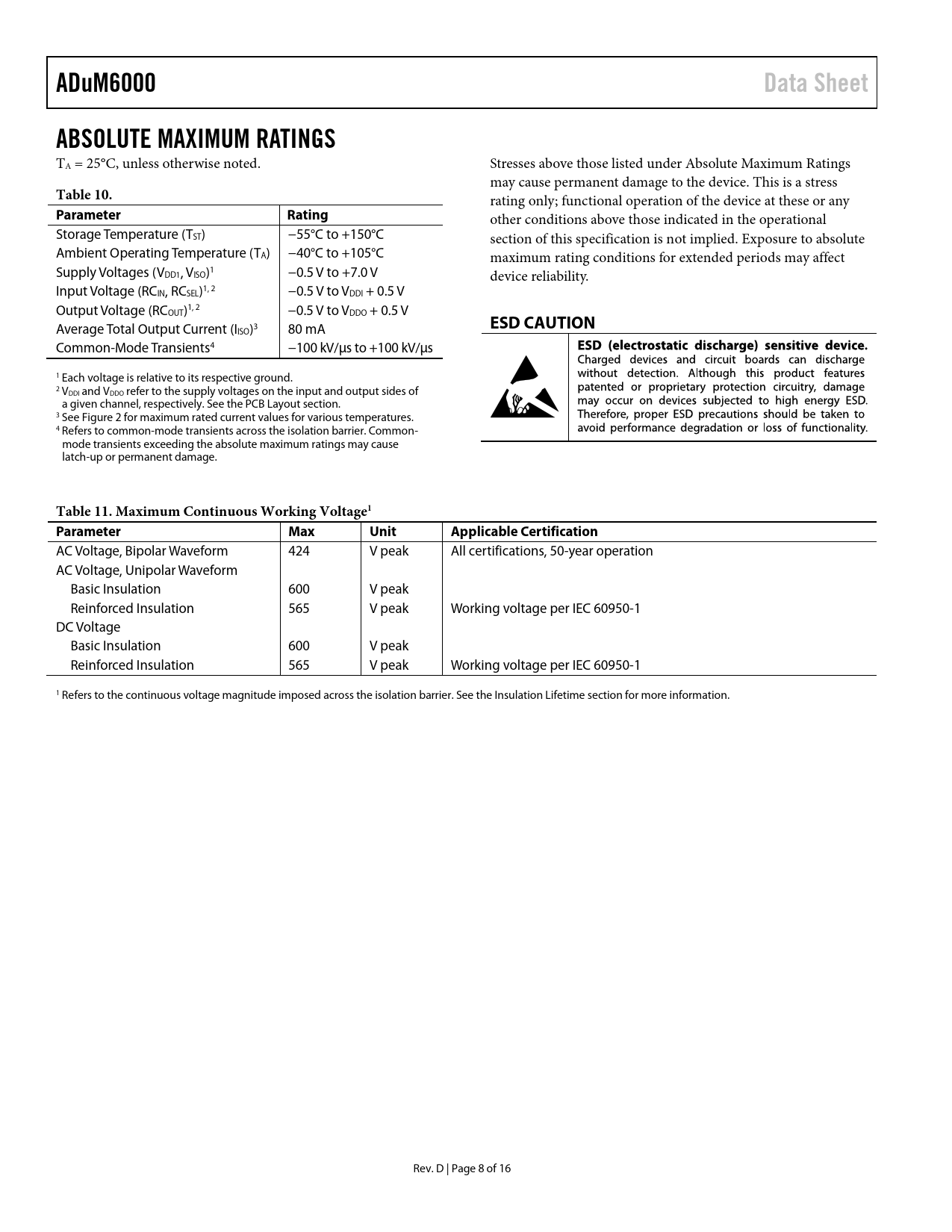ADuM6000 Data Sheet ABSOLUTE MAXIMUM RATINGS Table 10 Parameter Rating ESD CAUTION