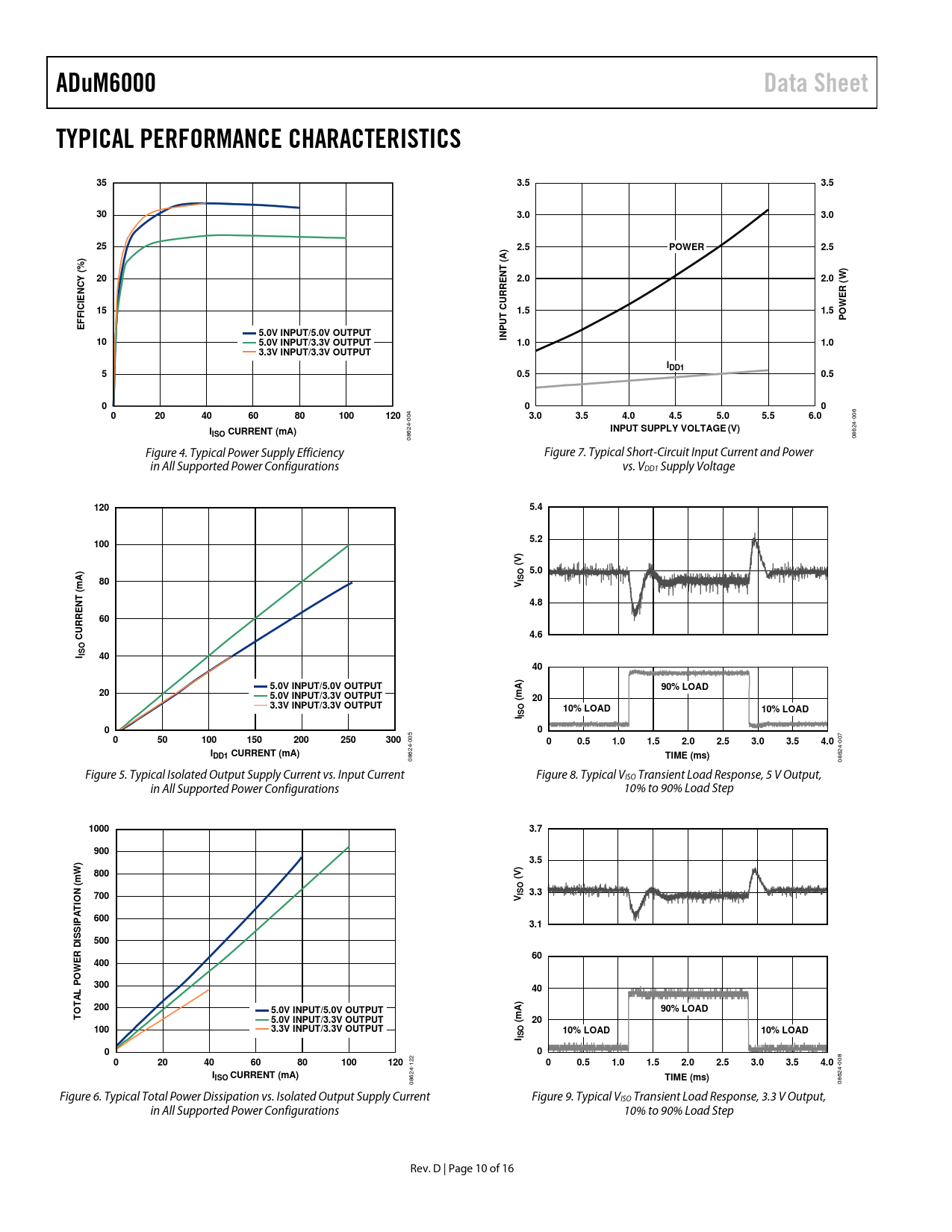 ADuM6000Data SheetTYPICAL PERFORMANCE CHARACTERISTICS353.53.5303.03.0252.5POWER2.5A) (%))( Y20NT2.02.0C(WNERIEW15CURRE1.51.5FFICUTPOE5.0V INPUT/5.0V OUTPUTINP105.0V INPUT/3.3V OUTPUT1.01.03.3V INPUT/3.3V OUTPUTIDD150.50.50000204060801001203.03.54.04.55.05.56.0 004 006 IINPUT SUPPLY VOLTAGE (V)ISO CURRENT (mA) 08624- 08624- Figure 4. Typical Power Supply Efficiency Figure 7. Typical Short-Circuit Input Current and Power in All Supported Power Configurations vs. VDD1 Supply Voltage 1205.45.2100(V) 5.080ISOmA)V( NT4.8604.6CURREI ISO40405.0V INPUT/5.0V OUTPUT90% LOAD205.0V INPUT/3.3V OUTPUTmA)20(3.3V INPUT/3.3V OUTPUT10% LOAD10% LOADI ISO00050100150200250300 005 00.51.01.52.02.53.03.54.0 007 IDD1 CURRENT (mA)TIME (ms) 08624- 08624- Figure 5. Typical Isolated Output Supply Current vs. Input Current Figure 8. Typical VISO Transient Load Response, 5 V Output, in All Supported Power Configurations 10% to 90% Load Step 10003.79003.5W)800m(V)(700ISO 3.3VTION A600IP3.1S IS500D R60400OWE300L P402005.0V INPUT/5.0V OUTPUT90% LOADTOTA5.0V INPUT/3.3V OUTPUTmA)20(1003.3V INPUT/3.3V OUTPUT10% LOAD10% LOADI ISO00020406080100120 122 00.51.01.52.02.53.03.54.0 008 IISO CURRENT (mA)TIME (ms) 08624- 08624- Figure 6. Typical Total Power Dissipation vs. Isolated Output Supply Current Figure 9. Typical VISO Transient Load Response, 3.3 V Output, in All Supported Power Configurations 10% to 90% Load Step Rev. D | Page 10 of 16 Document Outline Features Applications General Description Functional Block Diagram Revision History Specifications Electrical Characteristics—5 V Primary Input Supply/5 V Secondary Isolated Supply Electrical Characteristics—3.3 V Primary Input Supply/3.3 V Secondary Isolated Supply Electrical Characteristics—5 V Primary Input Supply/3.3 V Secondary Isolated Supply Package Characteristics Regulatory Information Insulation and Safety-Related Specifications DIN V VDE V 0884-10 (VDE V 0884-10) and IEC 60747-5-2 (VDE 0884 Part 2):2003-01 Insulation Characteristics Thermal Derating Curve Recommended Operating Conditions Absolute Maximum Ratings ESD Caution Pin Configuration and Function Descriptions Typical Performance Characteristics Applications Information PCB Layout Start-Up Behavior EMI Considerations Thermal Analysis Current Limit and Thermal Overload Protection Power Considerations Increasing Available Power Insulation Lifetime Outline Dimensions Ordering Guide
