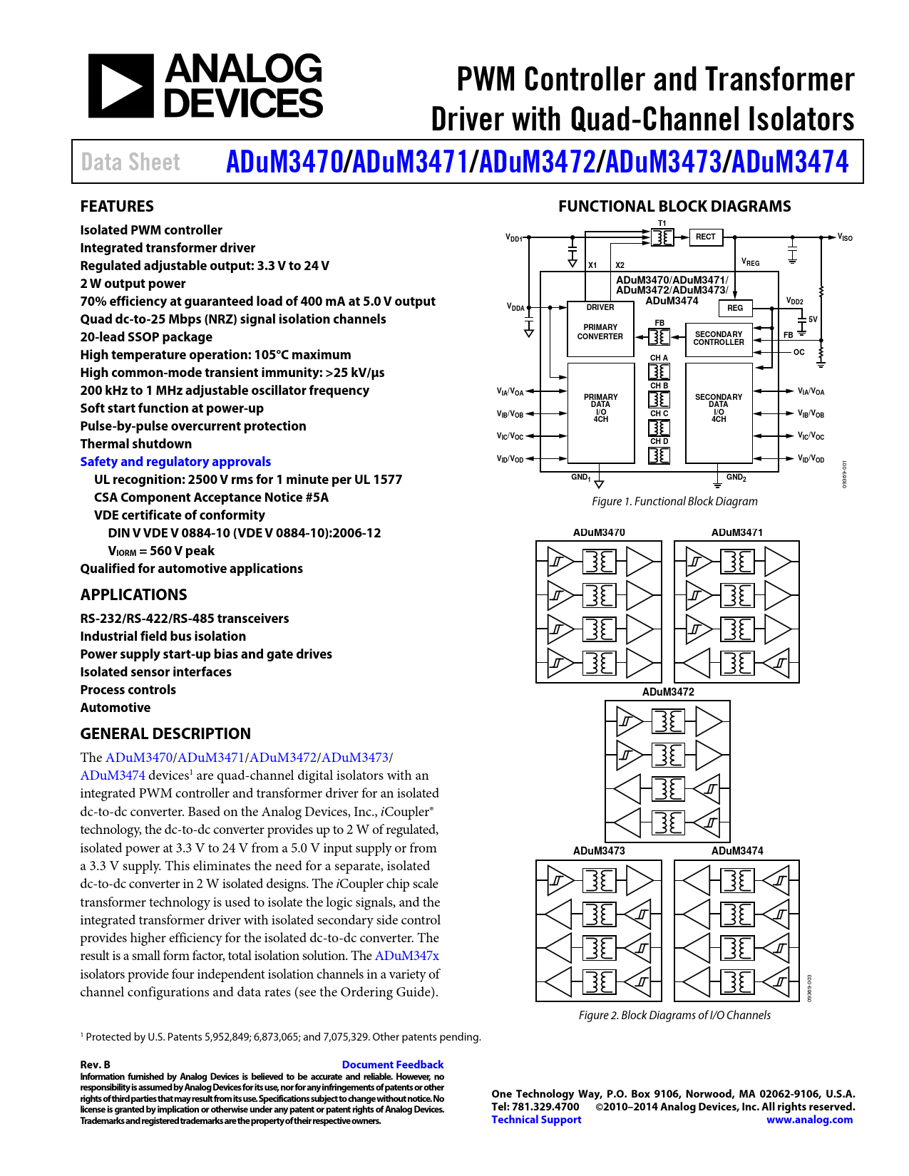 The ADuM3470/ADuM3471/ADuM3472/ADuM3473/ ADuM3474 devices1 are quad-channel digital isolators with an integrated PWM controller and transformer driver for an isolated dc-to-dc converter. Based on the Analog Devices, Inc., iCoupler® technology, the dc-to-dc converter provides up to 2 W of regulated, isolated power at 3.3 V to 24 V from a 5.0 V input supply or from