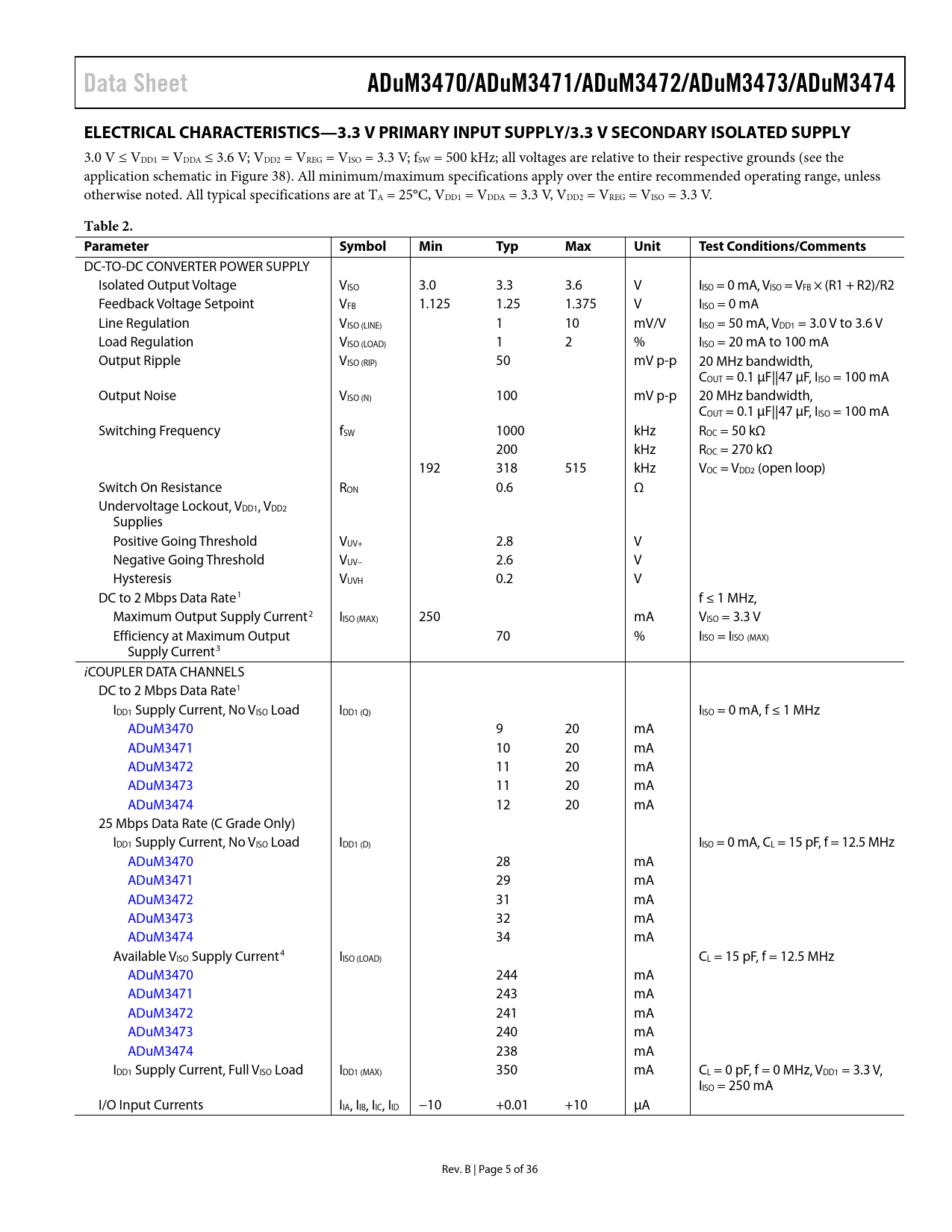 link to page 25 link to page 6 link to page 6 link to page 6 link to page 6 link to page 6 Data SheetADuM3470/ADuM3471/ADuM3472/ADuM3473/ADuM3474ELECTRICAL CHARACTERISTICS—3.3 V PRIMARY INPUT SUPPLY/3.3 V SECONDARY ISOLATED SUPPLY 3.0 V ≤ VDD1 = VDDA ≤ 3.6 V; VDD2 = VREG = VISO = 3.3 V; fSW = 500 kHz; all voltages are relative to their respective grounds (see the application schematic in Figure 38). All minimum/maximum specifications apply over the entire recommended operating range, unless otherwise noted. All typical specifications are at TA = 25°C, VDD1 = VDDA = 3.3 V, VDD2 = VREG = VISO = 3.3 V. Table 2. ParameterSymbolMinTypMaxUnitTest Conditions/Comments DC-TO-DC CONVERTER POWER SUPPLY Isolated Output Voltage VISO 3.0 3.3 3.6 V IISO = 0 mA, VISO = VFB × (R1 + R2)/R2 Feedback Voltage Setpoint VFB 1.125 1.25 1.375 V IISO = 0 mA Line Regulation VISO (LINE) 1 10 mV/V IISO = 50 mA, VDD1 = 3.0 V to 3.6 V Load Regulation VISO (LOAD) 1 2 % IISO = 20 mA to 100 mA Output Ripple VISO (RIP) 50 mV p-p 20 MHz bandwidth, COUT = 0.1 µF||47 µF, IISO = 100 mA Output Noise VISO (N) 100 mV p-p 20 MHz bandwidth, COUT = 0.1 µF||47 µF, IISO = 100 mA Switching Frequency fSW 1000 kHz ROC = 50 kΩ 200 kHz ROC = 270 kΩ 192 318 515 kHz VOC = VDD2 (open loop) Switch On Resistance RON 0.6 Ω Undervoltage Lockout, VDD1, VDD2 Supplies Positive Going Threshold VUV+ 2.8 V Negative Going Threshold VUV− 2.6 V Hysteresis VUVH 0.2 V DC to 2 Mbps Data Rate1 f ≤ 1 MHz, Maximum Output Supply Current2 IISO (MAX) 250 mA VISO = 3.3 V Efficiency at Maximum Output 70 % IISO = IISO (MAX) Supply Current3 iCOUPLER DATA CHANNELS DC to 2 Mbps Data Rate1 IDD1 Supply Current, No VISO Load IDD1 (Q) IISO = 0 mA, f ≤ 1 MHz ADuM3470 9 20 mA ADuM3471 10 20 mA ADuM3472 11 20 mA ADuM3473 11 20 mA ADuM3474 12 20 mA 25 Mbps Data Rate (C Grade Only) IDD1 Supply Current, No VISO Load IDD1 (D) IISO = 0 mA, CL = 15 pF, f = 12.5 MHz ADuM3470 28 mA ADuM3471 29 mA ADuM3472 31 mA ADuM3473 32 mA ADuM3474 34 mA Available VISO Supply Current4 IISO (LOAD) CL = 15 pF, f = 12.5 MHz ADuM3470 244 mA ADuM3471 243 mA ADuM3472 241 mA ADuM3473 240 mA ADuM3474 238 mA IDD1 Supply Current, Full VISO Load IDD1 (MAX) 350 mA CL = 0 pF, f = 0 MHz, VDD1 = 3.3 V, IISO = 250 mA I/O Input Currents IIA, IIB, IIC, IID −10 +0.01 +10 µA Rev. B | Page 5 of 36 Document Outline Features Applications General Description Functional Block Diagrams Table of Contents Revision History Specifications Electrical Characterstics—5 V Primary Input Supply/5 V Secondary Isolated Supply Electrical Characteristics—3.3 V Primary Input Supply/3.3 V Secondary Isolated Supply Electrical Characteristics—5 V Primary Input Supply/3.3 V Secondary Isolated Supply Electrical Characteristics—5 V Primary Input Supply/15 V Secondary Isolated Supply Package Characteristics Regulatory Approvals Insulation and Safety-Related Specifications DIN V VDE V 0884-10 (VDE V 0884-10):2006-12 Insulation Characteristics Recommended Operating Conditions Absolute Maximum Ratings ESD Caution Pin Configurations and Function Descriptions Typical Performance Characteristics Terminology Applications Information Application Schematics Transformer Design Transformer Turns Ratio Transformer ET Constant Transformer Primary Inductance and Resistance Transformer Isolation Voltage Switching Frequency Transient Response Component Selection Printed Circuit Board (PCB) Layout Thermal Analysis Propagation Delay-Related Parameters DC Correctness and Magnetic Field Immunity Power Consumption Power Considerations Soft Start Mode and Current-Limit Protection Data Channel Power Cycle Insulation Lifetime Outline Dimensions Ordering Guide Automotive Products