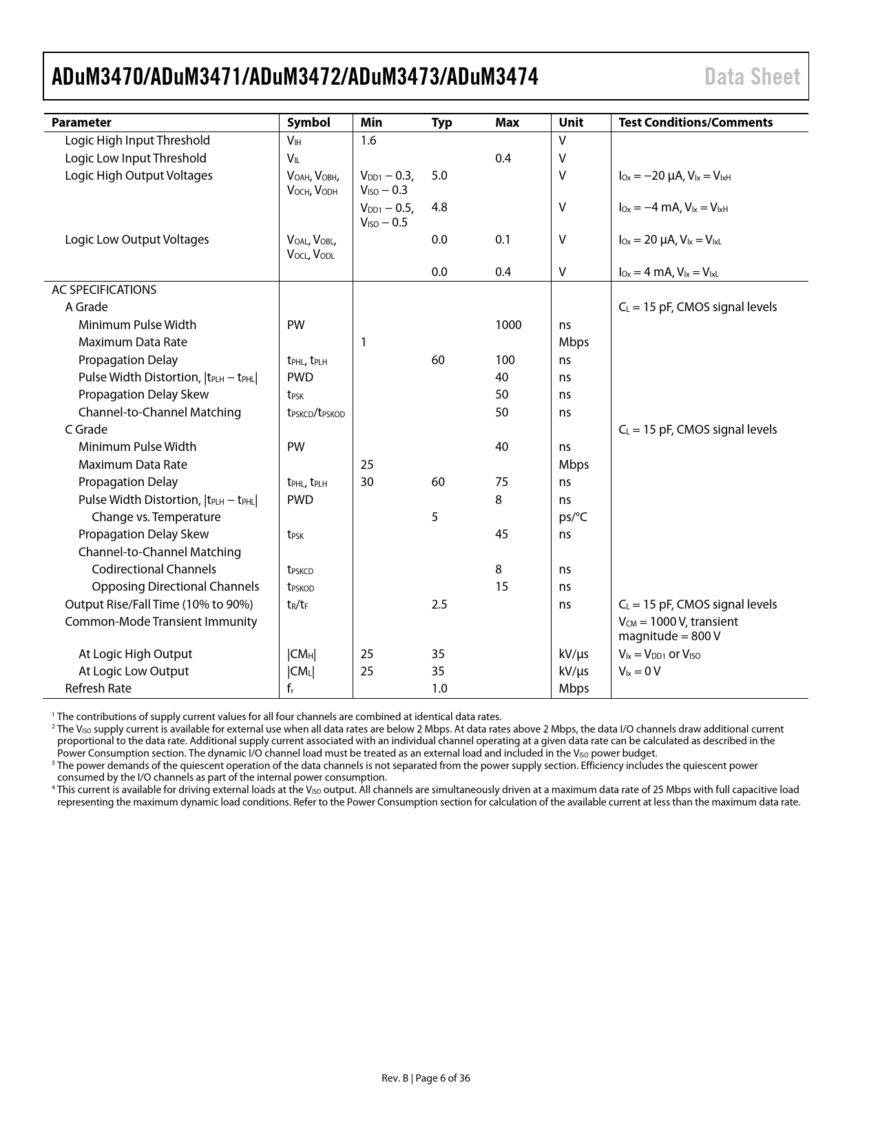 link to page 30 link to page 30 ADuM3470/ADuM3471/ADuM3472/ADuM3473/ADuM3474Data SheetParameterSymbolMinTypMaxUnitTest Conditions/Comments Logic High Input Threshold VIH 1.6 V Logic Low Input Threshold VIL 0.4 V Logic High Output Voltages VOAH, VOBH, VDD1 − 0.3, 5.0 V IOx = −20 µA, VIx = VIxH VOCH, VODH VISO − 0.3 VDD1 − 0.5, 4.8 V IOx = −4 mA, VIx = VIxH VISO − 0.5 Logic Low Output Voltages VOAL, VOBL, 0.0 0.1 V IOx = 20 µA, VIx = VIxL VOCL, VODL 0.0 0.4 V IOx = 4 mA, VIx = VIxL AC SPECIFICATIONS A Grade CL = 15 pF, CMOS signal levels Minimum Pulse Width PW 1000 ns Maximum Data Rate 1 Mbps Propagation Delay tPHL, tPLH 60 100 ns Pulse Width Distortion, |tPLH − tPHL| PWD 40 ns Propagation Delay Skew tPSK 50 ns Channel-to-Channel Matching tPSKCD/tPSKOD 50 ns C Grade CL = 15 pF, CMOS signal levels Minimum Pulse Width PW 40 ns Maximum Data Rate 25 Mbps Propagation Delay tPHL, tPLH 30 60 75 ns Pulse Width Distortion, |tPLH − tPHL| PWD 8 ns Change vs. Temperature 5 ps/°C Propagation Delay Skew tPSK 45 ns Channel-to-Channel Matching Codirectional Channels tPSKCD 8 ns Opposing Directional Channels tPSKOD 15 ns Output Rise/Fall Time (10% to 90%) tR/tF 2.5 ns CL = 15 pF, CMOS signal levels Common-Mode Transient Immunity VCM = 1000 V, transient magnitude = 800 V At Logic High Output |CMH| 25 35 kV/µs VIx = VDD1 or VISO At Logic Low Output |CML| 25 35 kV/µs VIx = 0 V Refresh Rate fr 1.0 Mbps 1 The contributions of supply current values for all four channels are combined at identical data rates. 2 The VISO supply current is available for external use when all data rates are below 2 Mbps. At data rates above 2 Mbps, the data I/O channels draw additional current proportional to the data rate. Additional supply current associated with an individual channel operating at a given data rate can be calculated as described in the Power Consumption section. The dynamic I/O channel load must be treated as an external load and included in the VISO power budget. 3 The power demands of the quiescent operation of the data channels is not separated from the power supply section. Efficiency includes the quiescent power consumed by the I/O channels as part of the internal power consumption. 4 This current is available for driving external loads at the VISO output. All channels are simultaneously driven at a maximum data rate of 25 Mbps with full capacitive load representing the maximum dynamic load conditions. Refer to the Power Consumption section for calculation of the available current at less than the maximum data rate. Rev. B | Page 6 of 36 Document Outline Features Applications General Description Functional Block Diagrams Table of Contents Revision History Specifications Electrical Characterstics—5 V Primary Input Supply/5 V Secondary Isolated Supply Electrical Characteristics—3.3 V Primary Input Supply/3.3 V Secondary Isolated Supply Electrical Characteristics—5 V Primary Input Supply/3.3 V Secondary Isolated Supply Electrical Characteristics—5 V Primary Input Supply/15 V Secondary Isolated Supply Package Characteristics Regulatory Approvals Insulation and Safety-Related Specifications DIN V VDE V 0884-10 (VDE V 0884-10):2006-12 Insulation Characteristics Recommended Operating Conditions Absolute Maximum Ratings ESD Caution Pin Configurations and Function Descriptions Typical Performance Characteristics Terminology Applications Information Application Schematics Transformer Design Transformer Turns Ratio Transformer ET Constant Transformer Primary Inductance and Resistance Transformer Isolation Voltage Switching Frequency Transient Response Component Selection Printed Circuit Board (PCB) Layout Thermal Analysis Propagation Delay-Related Parameters DC Correctness and Magnetic Field Immunity Power Consumption Power Considerations Soft Start Mode and Current-Limit Protection Data Channel Power Cycle Insulation Lifetime Outline Dimensions Ordering Guide Automotive Products