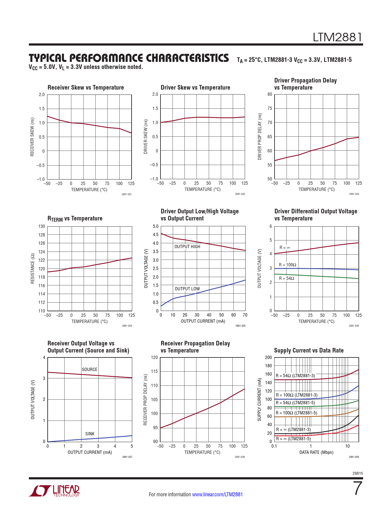 Typical perForMance characTerisTics TA = 25°C, LTM2881-3 VCC = 3.3V, LTM2881-5 VCC = 5.0V, VL = 3.3V unless otherwise noted. Driver Propagation Delay Receiver Skew vs Temperature Driver Skew vs Temperature vs Temperature
