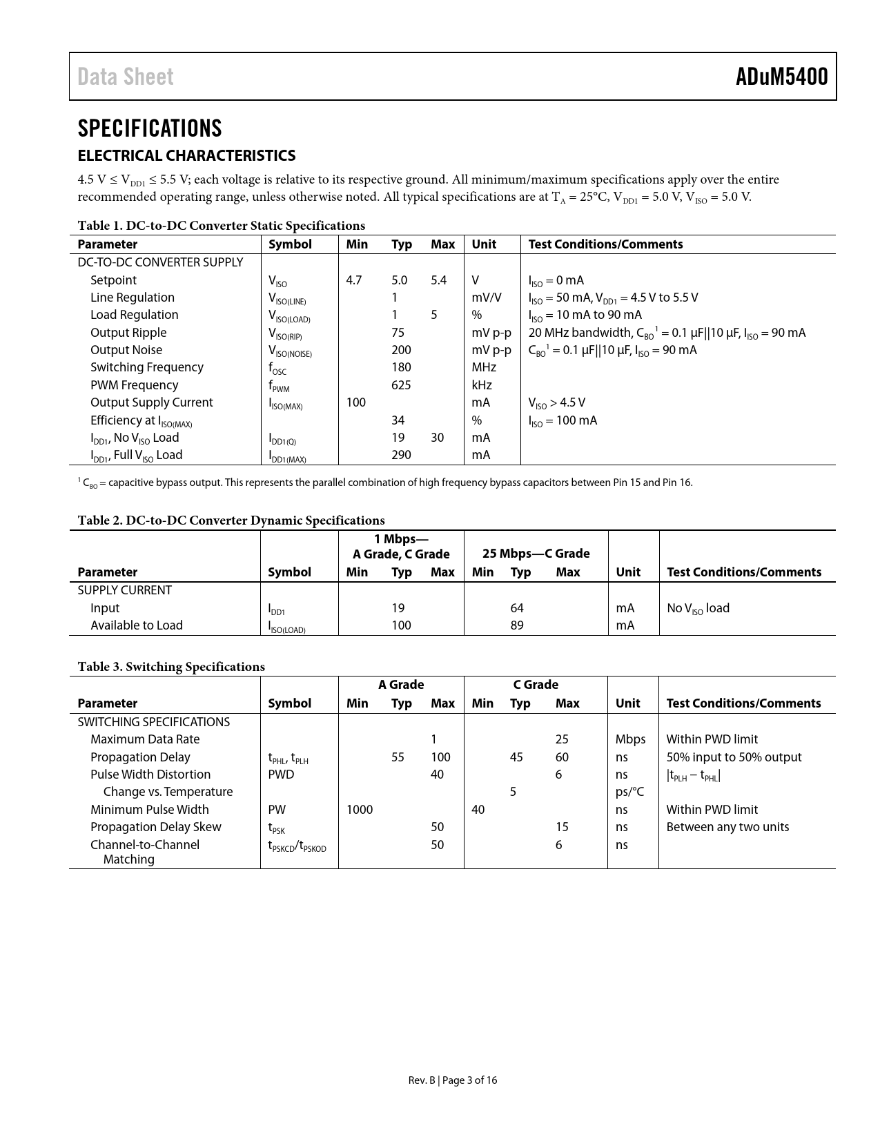 Data Sheet ADuM5400 SPECIFICATIONS ELECTRICAL CHARACTERISTICS Table 1 DC-to-DC Converter Static Specifications Parameter