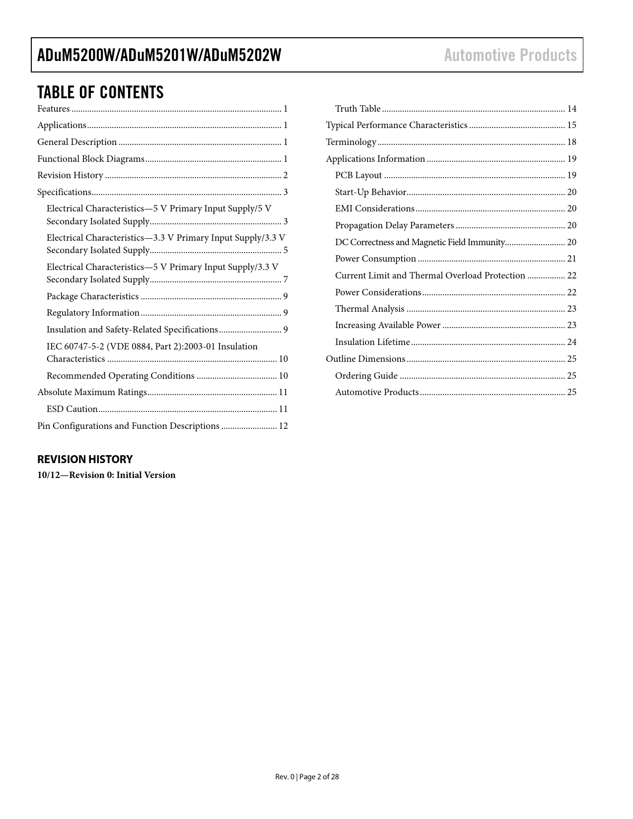 ADuM5200W/ADuM5201W/ADuM5202W. Automotive Products. TABLE OF CONTENTS. REVISION HISTORY 10/12—Revision 0: Initial Version