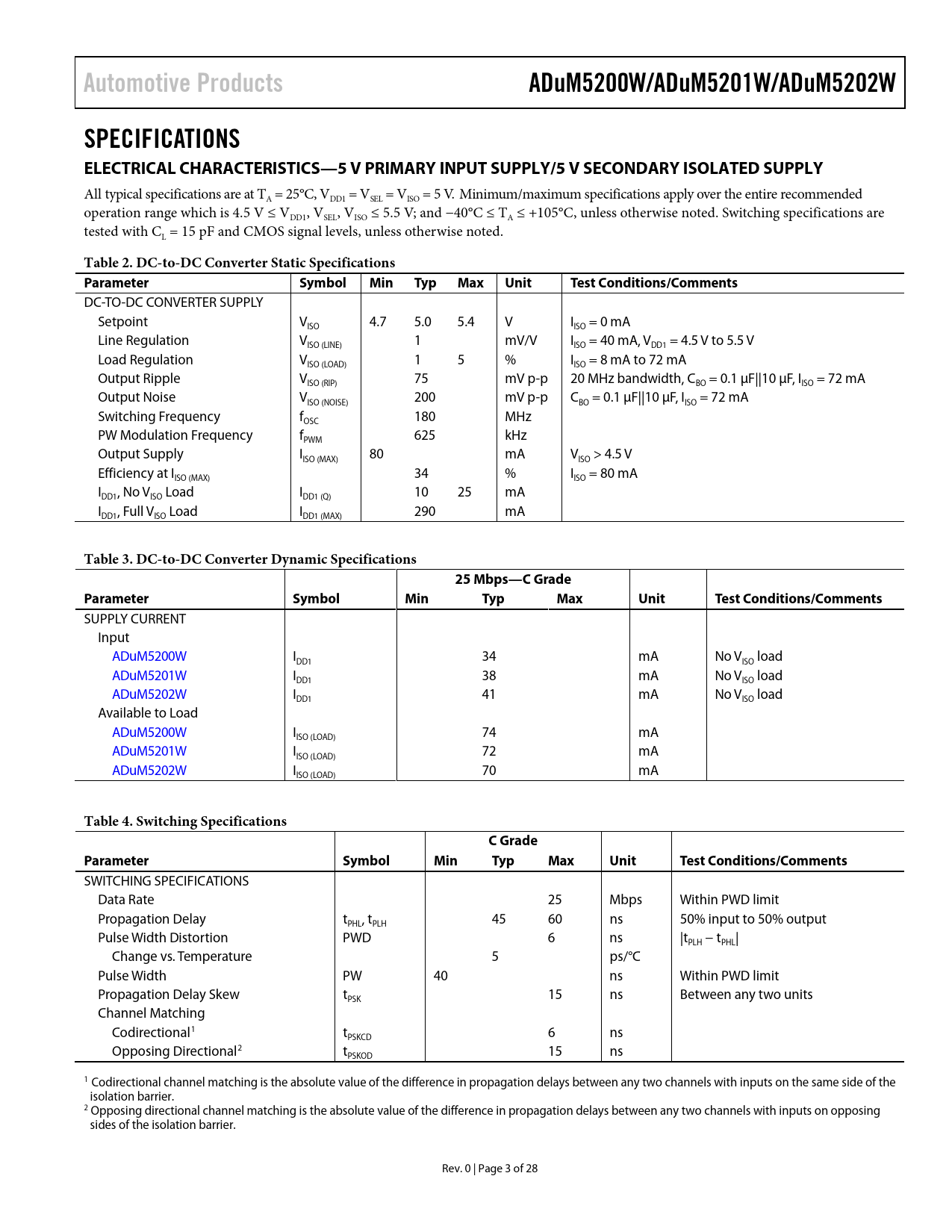 Automotive Products ADuM5200W/ADuM5201W/ADuM5202W SPECIFICATIONS ELECTRICAL CHARACTERISTICS—5 V PRIMARY INPUT SUPPLY/5 V SECONDARY ISOLATED SUPPLY
