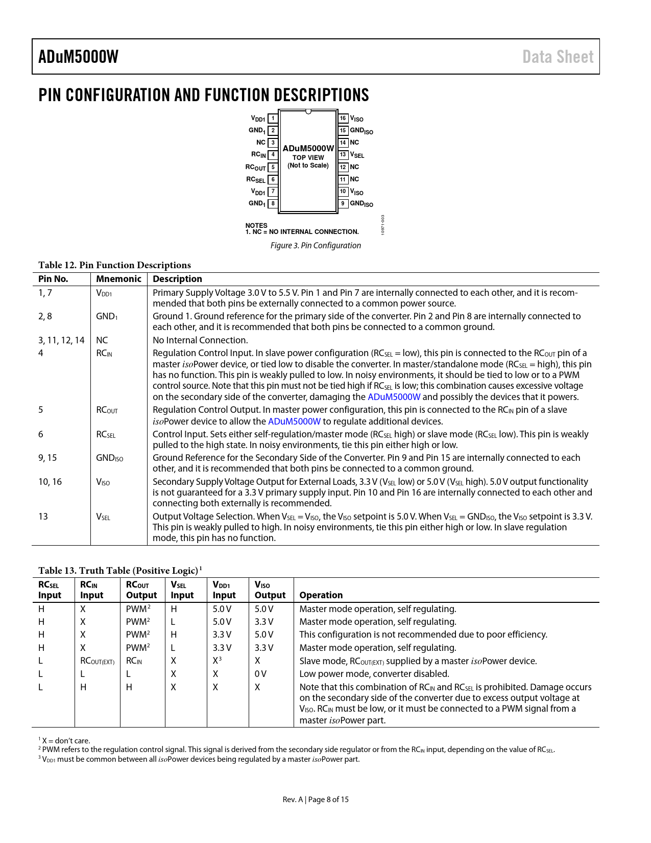 1, 7 VDD1 Primary Supply Voltage 3.0 V to 5.5 V. Pin 1 and Pin 7 are internally connected to each other, and it is recom- mended that both pins be externally connected to a common power source. 2, 8 GND1 Ground 1. Ground reference for the primary side of the converter. Pin 2 and Pin 8 are internally connected to each other, and it is recommended that both pins be connected to a common ground. 3, 11, 12, 14 NC No Internal Connection. 4 RCIN Regulation Control Input. In slave power configuration (RCSEL = low), this pin is connected to the RCOUT pin of a master isoPower device, or tied low to disable the converter. In master/standalone mode (RCSEL = high), this pin has no function. This pin is weakly pulled to low. In noisy environments, it should be tied to low or to a PWM control source. Note that this pin must not be tied high if RCSEL is low; this combination causes excessive voltage on the secondary side of the converter, damaging the ADuM5000W and possibly the devices that it powers. 5 RCOUT Regulation Control Output. In master power configuration, this pin is connected to the RCIN pin of a slave isoPower device to allow the ADuM5000W to regulate additional devices. 6 RCSEL Control Input. Sets either self-regulation/master mode (RCSEL high) or slave mode (RCSEL low). This pin is weakly pulled to the high state. In noisy environments, tie this pin either high or low. 9, 15 GNDISO Ground Reference for the Secondary Side of the Converter. Pin 9 and Pin 15 are internally connected to each other, and it is recommended that both pins be connected to a common ground. 10, 16 VISO Secondary Supply Voltage Output for External Loads, 3.3 V (VSEL low) or 5.0 V (VSEL high). 5.0 V output functionality is not guaranteed for a 3.3 V primary supply input. Pin 10 and Pin 16 are internally connected to each other and connecting both externally is recommended. 13 VSEL Output Voltage Selection. When VSEL = VISO, the VISO setpoint is 5.0 V. When VSEL = GNDISO, the VISO setpoint is 3.3 V. This pin is weakly pulled to high. In noisy environments, tie this pin either high or low. In slave regulation mode, this pin has no function.
