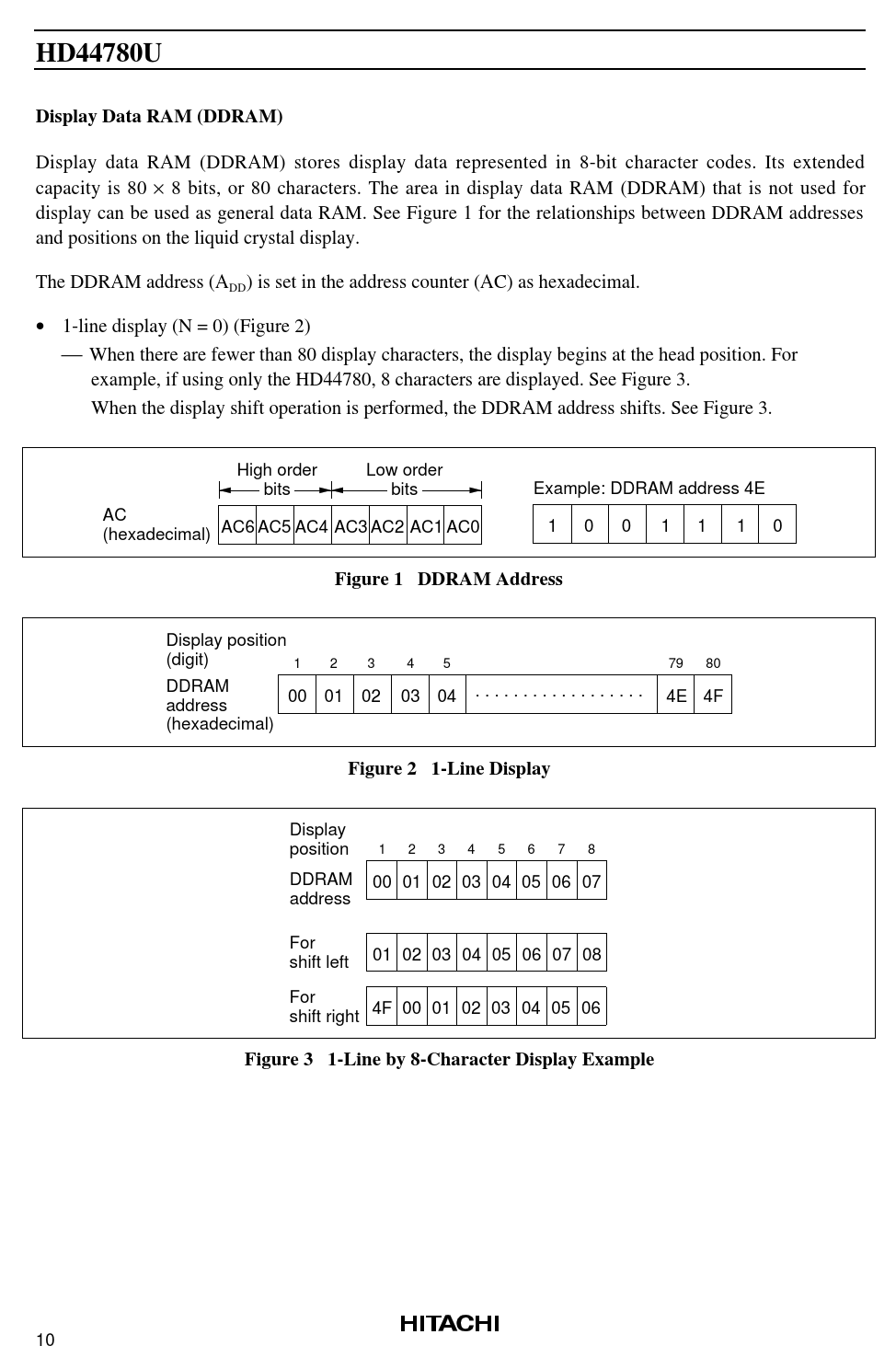 Display data RAM (DDRAM) stores display data represented in 8-bit character codes. Its extended capacity is 80 × 8 bits, or 80 characters. The area in display data RAM (DDRAM) that is not used for display can be used as general data RAM. See Figure 1 for the relationships between DDRAM addresses and positions on the liquid crystal display. The DDRAM address (A ) is set in the address counter (AC) as hexadecimal. DD • 1-line display (N = 0) (Figure 2)  When there are fewer than 80 display characters, the display begins at the head position. For example, if using only the HD44780, 8 characters are displayed. See Figure 3. When the display shift operation is performed, the DDRAM address shifts. See Figure 3. High order Low order bits bits Example: DDRAM address 4E AC AC6 AC5 AC4 AC3 AC2 AC1 AC0 1 0 0 1 1 1 0 (hexadecimal)