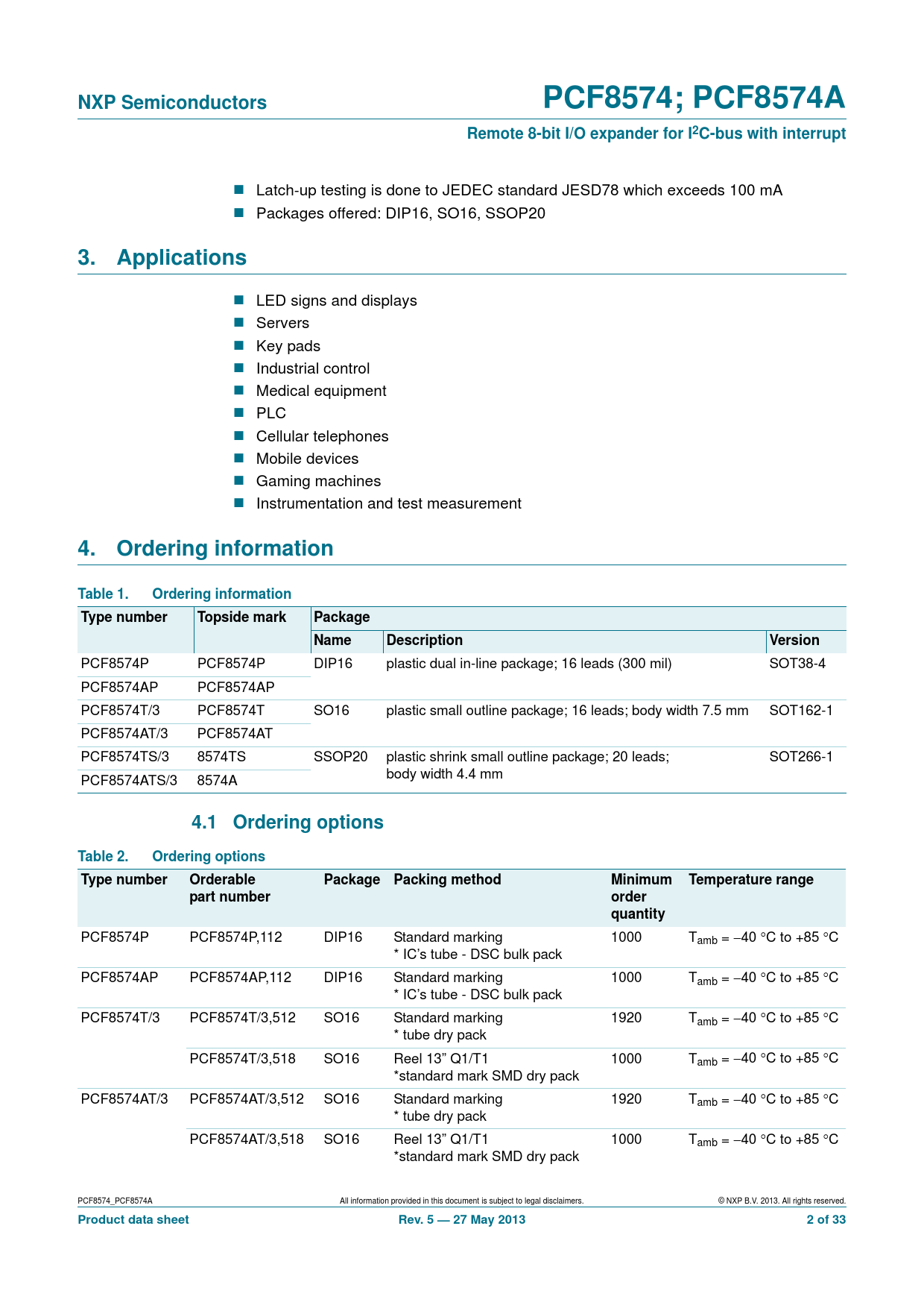 NXP Semiconductors. PCF8574; PCF8574A. Remote 8-bit I/O expander for I2C-bus with interrupt. 3. Applications. 4. Ordering