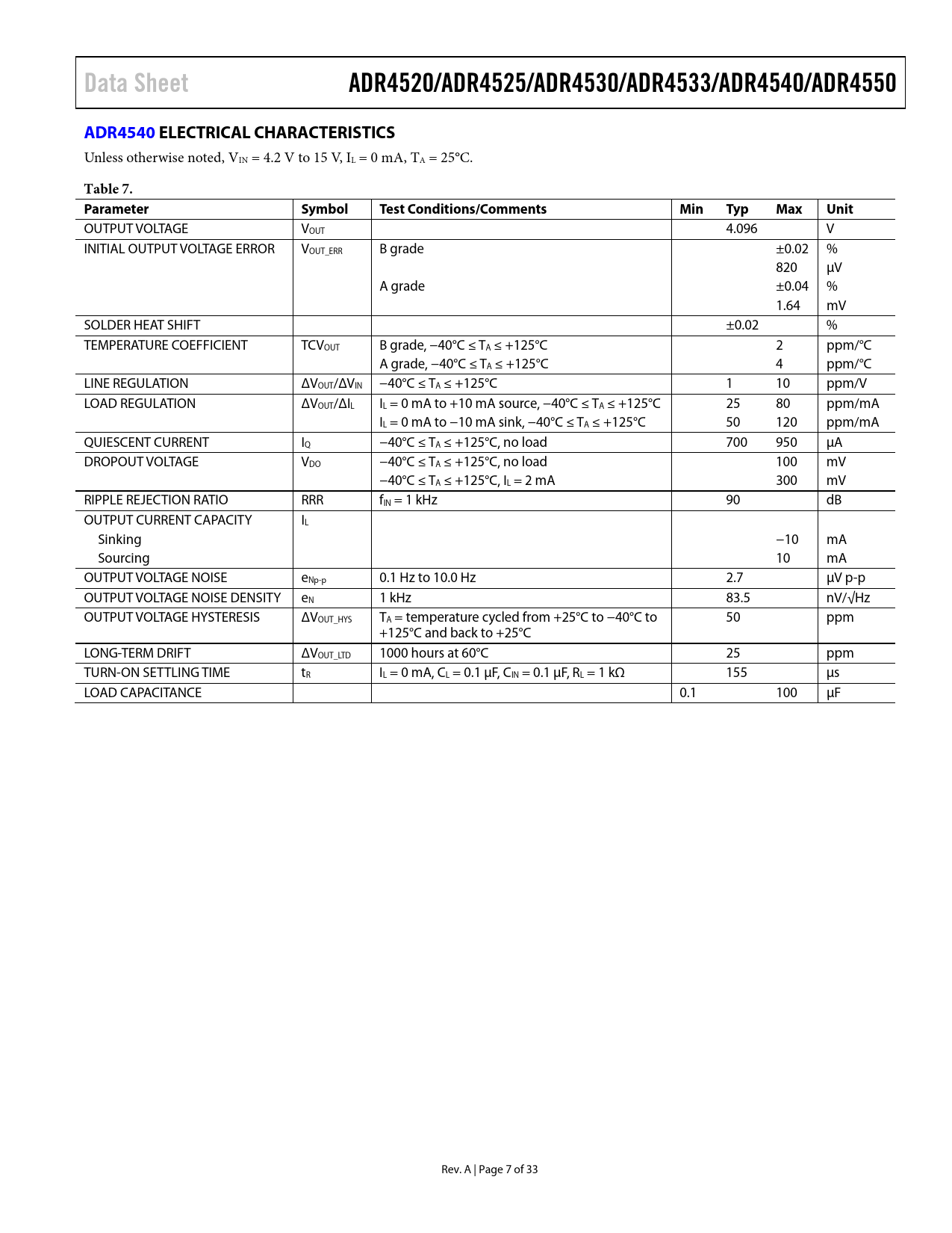 Data SheetADR4520/ADR4525/ADR4530/ADR4533/ADR4540/ADR4550ADR4540ELECTRICAL CHARACTERISTICS Unless otherwise noted, VIN = 4.2 V to 15 V, IL = 0 mA, TA = 25°C. Table 7. ParameterSymbolTest Conditions/CommentsMinTypMaxUnit OUTPUT VOLTAGE VOUT 4.096 V INITIAL OUTPUT VOLTAGE ERROR VOUT_ERR B grade ±0.02 % 820 μV A grade ±0.04 % 1.64 mV SOLDER HEAT SHIFT ±0.02 % TEMPERATURE COEFFICIENT TCVOUT B grade, −40°C ≤ TA ≤ +125°C 2 ppm/°C A grade, −40°C ≤ TA ≤ +125°C 4 ppm/°C LINE REGULATION ΔVOUT/ΔVIN −40°C ≤ TA ≤ +125°C 1 10 ppm/V LOAD REGULATION ΔVOUT/ΔIL IL = 0 mA to +10 mA source, −40°C ≤ TA ≤ +125°C 25 80 ppm/mA IL = 0 mA to −10 mA sink, −40°C ≤ TA ≤ +125°C 50 120 ppm/mA QUIESCENT CURRENT IQ −40°C ≤ TA ≤ +125°C, no load 700 950 μA DROPOUT VOLTAGE VDO −40°C ≤ TA ≤ +125°C, no load 100 mV −40°C ≤ TA ≤ +125°C, IL = 2 mA 300 mV RIPPLE REJECTION RATIO RRR fIN = 1 kHz 90 dB OUTPUT CURRENT CAPACITY IL Sinking −10 mA Sourcing 10 mA OUTPUT VOLTAGE NOISE eNp-p 0.1 Hz to 10.0 Hz 2.7 μV p-p OUTPUT VOLTAGE NOISE DENSITY eN 1 kHz 83.5 nV/√Hz OUTPUT VOLTAGE HYSTERESIS ΔVOUT_HYS TA = temperature cycled from +25°C to −40°C to 50 ppm +125°C and back to +25°C LONG-TERM DRIFT ΔVOUT_LTD 1000 hours at 60°C 25 ppm TURN-ON SETTLING TIME tR IL = 0 mA, CL = 0.1 µF, CIN = 0.1 µF, RL = 1 kΩ 155 µs LOAD CAPACITANCE 0.1 100 µF Rev. A | Page 7 of 33 Document Outline Features Applications Pin Configuration General Description Revision History Specifications ADR4520 Electrical Characteristics ADR4525 Electrical Characteristics ADR4530 Electrical Characteristics ADR4533 Electrical Characteristics ADR4540 Electrical Characteristics ADR4550 Electrical Characteristics Absolute Maximum Ratings Thermal Resistance ESD Caution Pin Configuration and Function Descriptions Typical Performance Characteristics ADR4520 ADR4525 ADR4530 ADR4533 ADR4540 ADR4550 Terminology Theory of Operation Long-Term Drift Power Dissipation Applications Information Basic Voltage Reference Connection Input and Output Capacitors Input Capacitors Output Capacitors Location of Reference in System Sample Applications Bipolar Output Reference Boosted Output Current Reference Outline Dimensions Ordering Guide Automotive Products