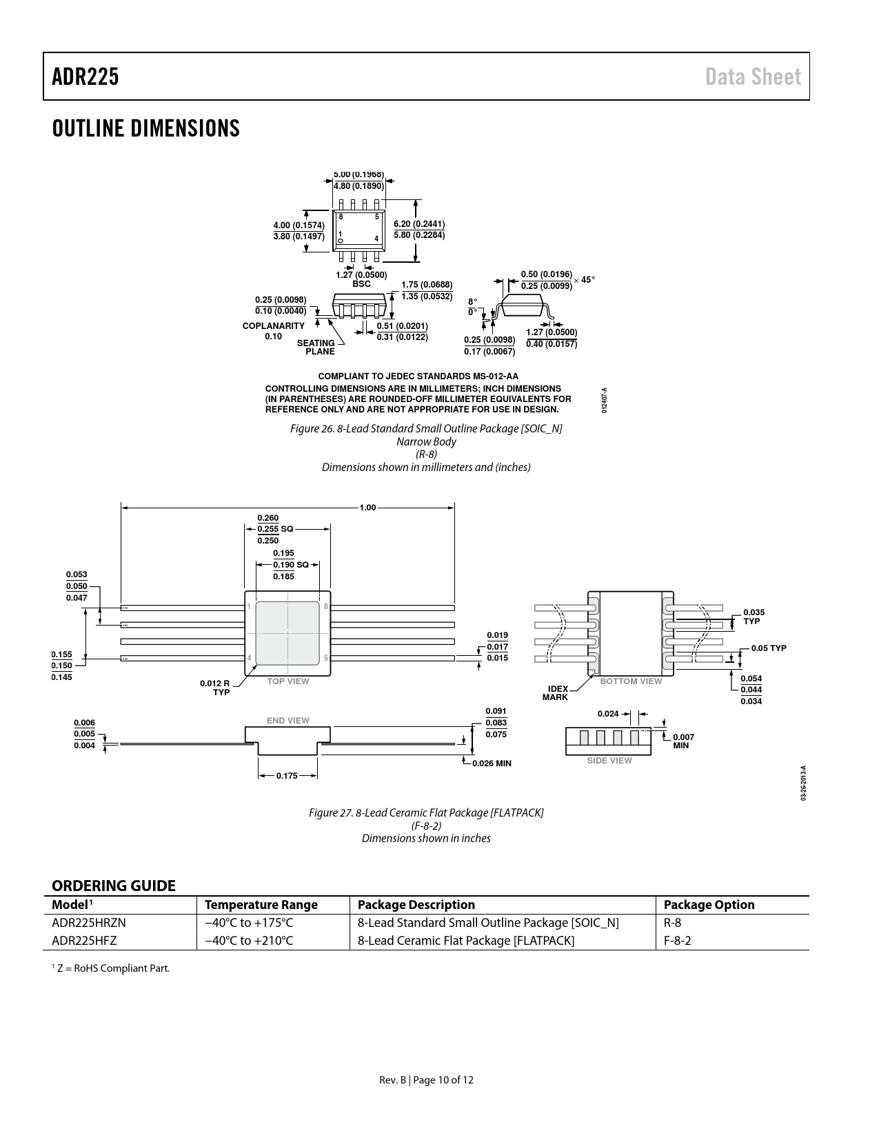 link to page 10 ADR225Data SheetOUTLINE DIMENSIONS5.00 (0.1968) 4.80 (0.1890)854.00 (0.1574)6.20 (0.2441)13.80 (0.1497)5.80 (0.2284)41.27 (0.0500)0.50 (0.0196)45°BSC1.75 (0.0688)0.25 (0.0099)1.35 (0.0532)0.25 (0.0098)8°0.10 (0.0040)0°COPLANARITY0.51 (0.0201)1.27 (0.0500)0.100.31 (0.0122)0.25 (0.0098)SEATING0.40 (0.0157)PLANE0.17 (0.0067)COMPLIANT TO JEDEC STANDARDS MS-012-AACONTROLLING DIMENSIONS ARE IN MILLIMETERS; INCH DIMENSIONS-A 7(IN PARENTHESES) ARE ROUNDED-OFF MILLIMETER EQUIVALENTS FOR0 4 2REFERENCE ONLY AND ARE NOT APPROPRIATE FOR USE IN DESIGN.1 0 Figure 26. 8-Lead Standard Small Outline Package [SOIC_N] Narrow Body (R-8) Dimensions shown in millimeters and (inches) 1.000.260 0.255 SQ 0.2500.195 0.190 SQ0.0530.1850.050 0.047180.035 TYP0.019 0.0170.05 TYP0.155450.0150.150 0.145TOP VIEWBOTTOM VIEW0.0540.012 RTYPIDEX0.044MARK0.0340.0910.024END VIEW0.0060.0830.0050.0750.0070.004MINSIDE VIEW0.026 MINA0.1752013-26-03- Figure 27. 8-Lead Ceramic Flat Package [FLATPACK] (F-8-2) Dimensions shown in inches ORDERING GUIDE Model1Temperature RangePackage DescriptionPackage Option ADR225HRZN −40°C to +175°C 8-Lead Standard Small Outline Package [SOIC_N] R-8 ADR225HFZ −40°C to +210°C 8-Lead Ceramic Flat Package [FLATPACK] F-8-2 1 Z = RoHS Compliant Part. Rev. B | Page 10 of 12 Document Outline Features Applications Pin Configuration General Description Table of Contents Revision History Specifications Electrical Characteristics Absolute Maximum Ratings Predicted Lifetime vs. Operating Temperature Thermal Resistance ESD Caution Typical Performance Characteristics Theory of Operation Basic Voltage Reference Connections Outline Dimensions Ordering Guide