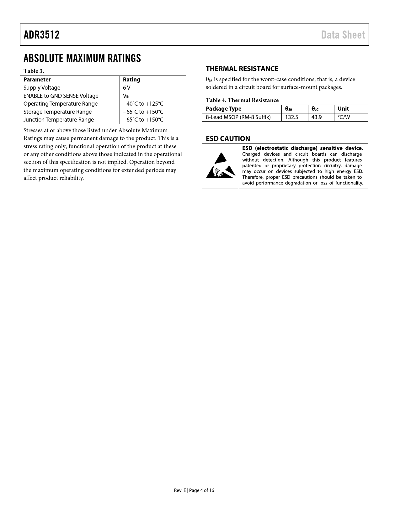 ADR3512Data SheetABSOLUTE MAXIMUM RATINGS Table 3.THERMAL RESISTANCEParameterRating θJA is specified for the worst-case conditions, that is, a device Supply Voltage 6 V soldered in a circuit board for surface-mount packages. ENABLE to GND SENSE Voltage VIN Operating Temperature Range −40°C to +125°C Table 4. Thermal Resistance Storage Temperature Range −65°C to +150°C Package TypeθJAθJCUnit Junction Temperature Range −65°C to +150°C 8-Lead MSOP (RM-8 Suffix) 132.5 43.9 °C/W Stresses at or above those listed under Absolute Maximum Ratings may cause permanent damage to the product. This is a ESD CAUTION stress rating only; functional operation of the product at these or any other conditions above those indicated in the operational section of this specification is not implied. Operation beyond the maximum operating conditions for extended periods may affect product reliability. Rev. E | Page 4 of 16 Document Outline FEATURES APPLICATIONS PIN CONFIGURATION GENERAL DESCRIPTION REVISION HISTORY SPECIFICATIONS ELECTRICAL CHARACTERISTICS ABSOLUTE MAXIMUM RATINGS THERMAL RESISTANCE ESD CAUTION PIN CONFIGURATION AND FUNCTION DESCRIPTIONS TYPICAL PERFORMANCE CHARACTERISTICS TERMINOLOGY THEORY OF OPERATION LONG-TERM OUTPUT VOLTAGE DRIFT POWER DISSIPATION APPLICATIONS INFORMATION BASIC VOLTAGE REFERENCE CONNECTION INPUT AND OUTPUT CAPACITORS 4-WIRE KELVIN CONNECTIONS VIN SLEW RATE CONSIDERATIONS SHUTDOWN/ENABLE FEATURE SAMPLE APPLICATIONS Negative Reference Bipolar Output Reference Boosted Output Current Reference OUTLINE DIMENSIONS ORDERING GUIDE AUTOMOTIVE PRODUCTS