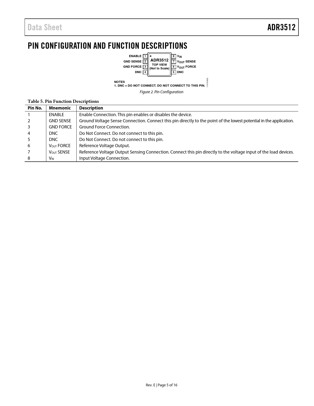 Data Sheet ADR3512 PIN CONFIGURATION AND FUNCTION DESCRIPTIONS ENABLE 1 8 VIN GND SENSE ADR3512 2 7 VOUT SENSE TOP VIEW GND FORCE 3 6 VOUT FORCE (Not to Scale) DNC 4 5 DNC NOTES
