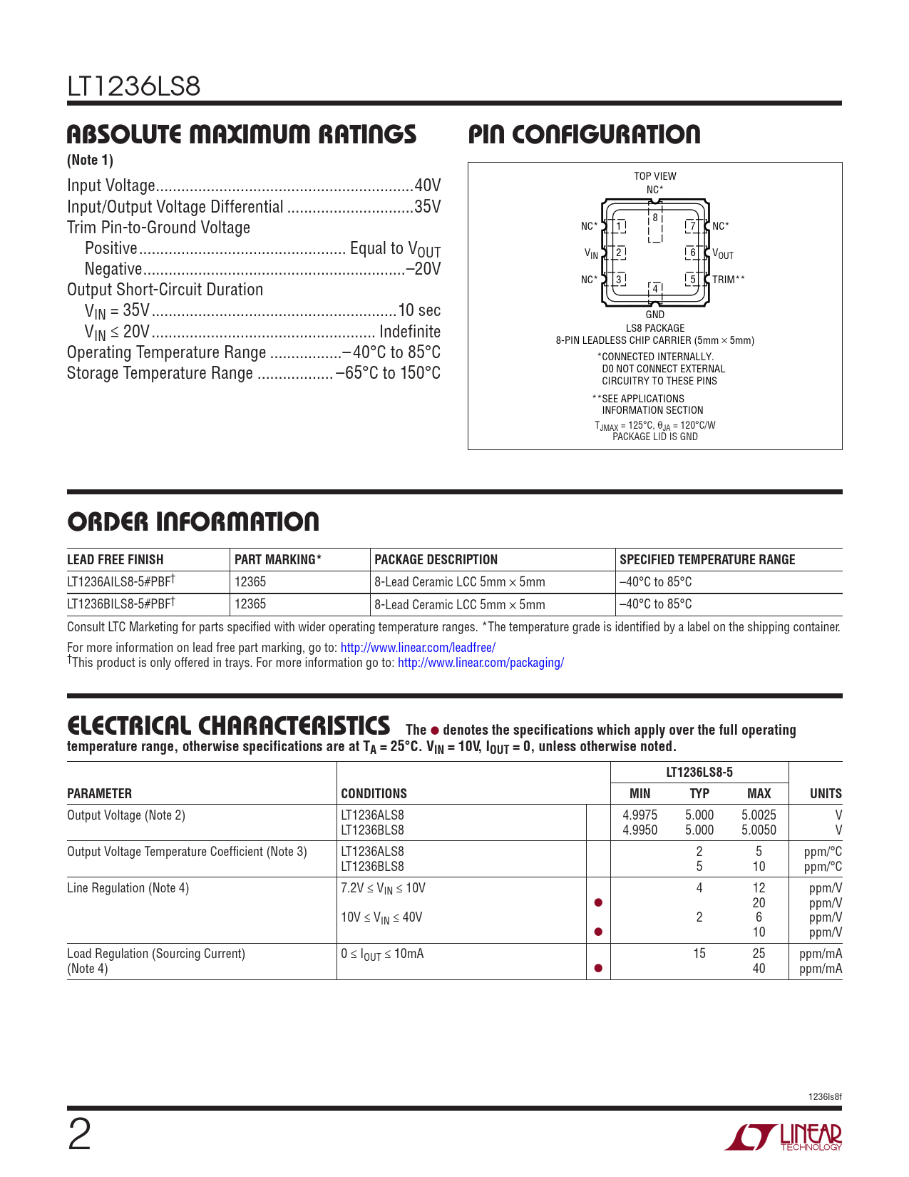 LT1236AILS8-5#PBF† 12365 8-Lead Ceramic LCC 5mm × 5mm –40°C to 85°C LT1236BILS8-5#PBF† 12365 8-Lead Ceramic LCC 5mm × 5mm –40°C to 85°C Consult LTC Marketing for parts specified with wider operating temperature ranges. *The temperature grade is identified by a label on the shipping container. For more information on lead free part marking, go to: http://www.linear.com/leadfree/ †This product is only offered in trays. For more information go to: http://www.linear.com/packaging/