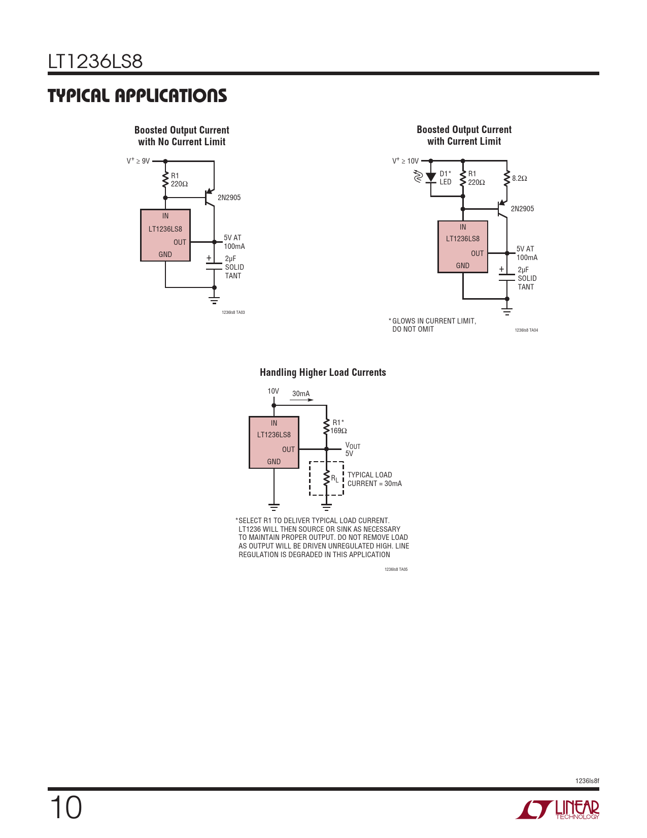 V+ ≥ 9V V+ ≥ 10V R1 D1* R1 8.2Ω 220Ω LED 220Ω 2N2905 2N2905 IN LT1236LS8 IN 5V AT OUT LT1236LS8 100mA 5V AT GND + OUT 2µF 100mA SOLID GND + 2µF TANT SOLID TANT 1236ls8 TA03 *GLOWS IN CURRENT LIMIT, DO NOT OMIT 1236ls8 TA04
