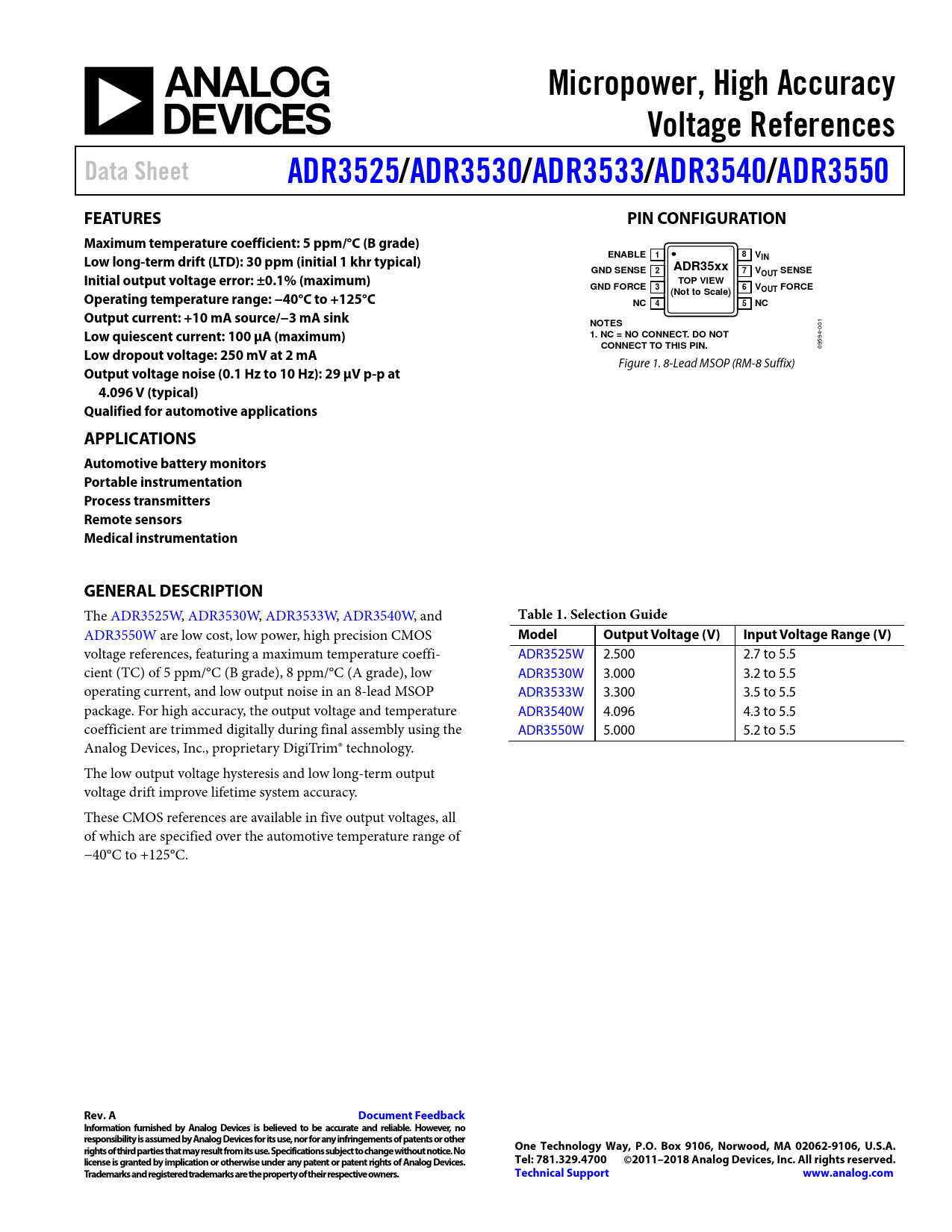 Micropower, High Accuracy. Voltage References. Data Sheet. ADR3525/. ADR3530/. ADR3533. /ADR3540/. ADR3550. FEATURES. PIN CONFIGURATION