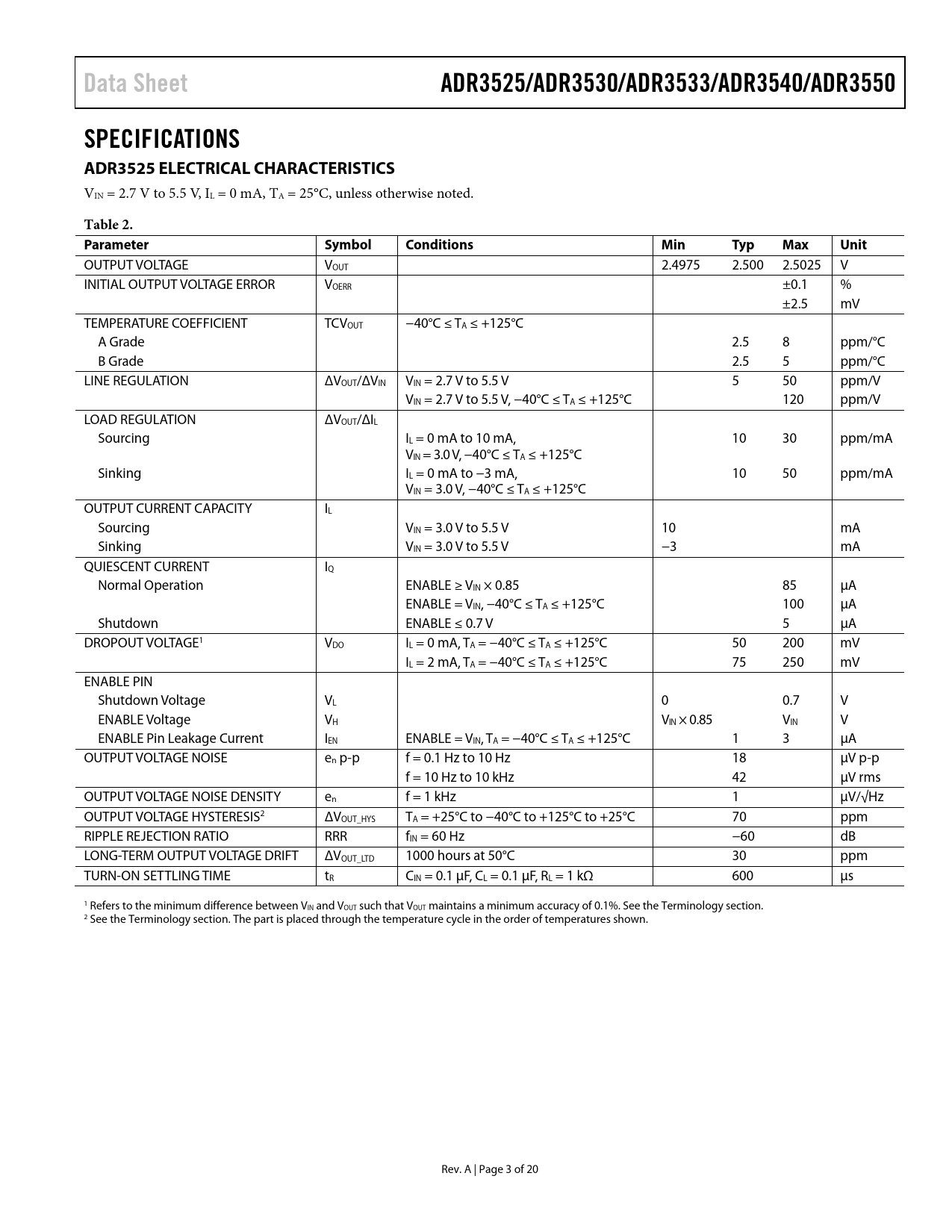 Data Sheet ADR3525/ADR3530/ADR3533/ADR3540/ADR3550 SPECIFICATIONS ADR3525 ELECTRICAL CHARACTERISTICS