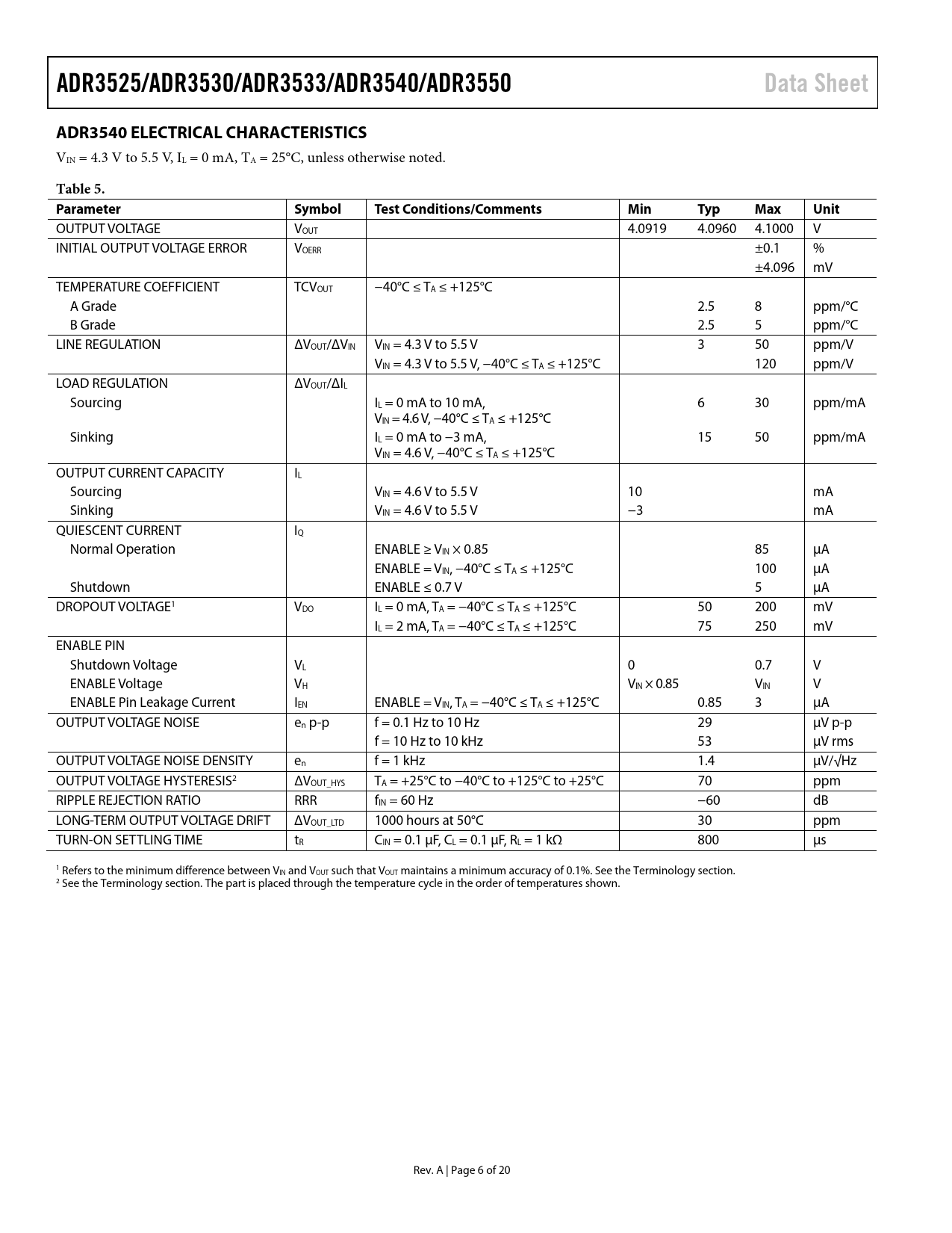 ADR3525/ADR3530/ADR3533/ADR3540/ADR3550. Data Sheet. ADR3540 ELECTRICAL CHARACTERISTICS. Table 5. Parameter Symbol. Test
