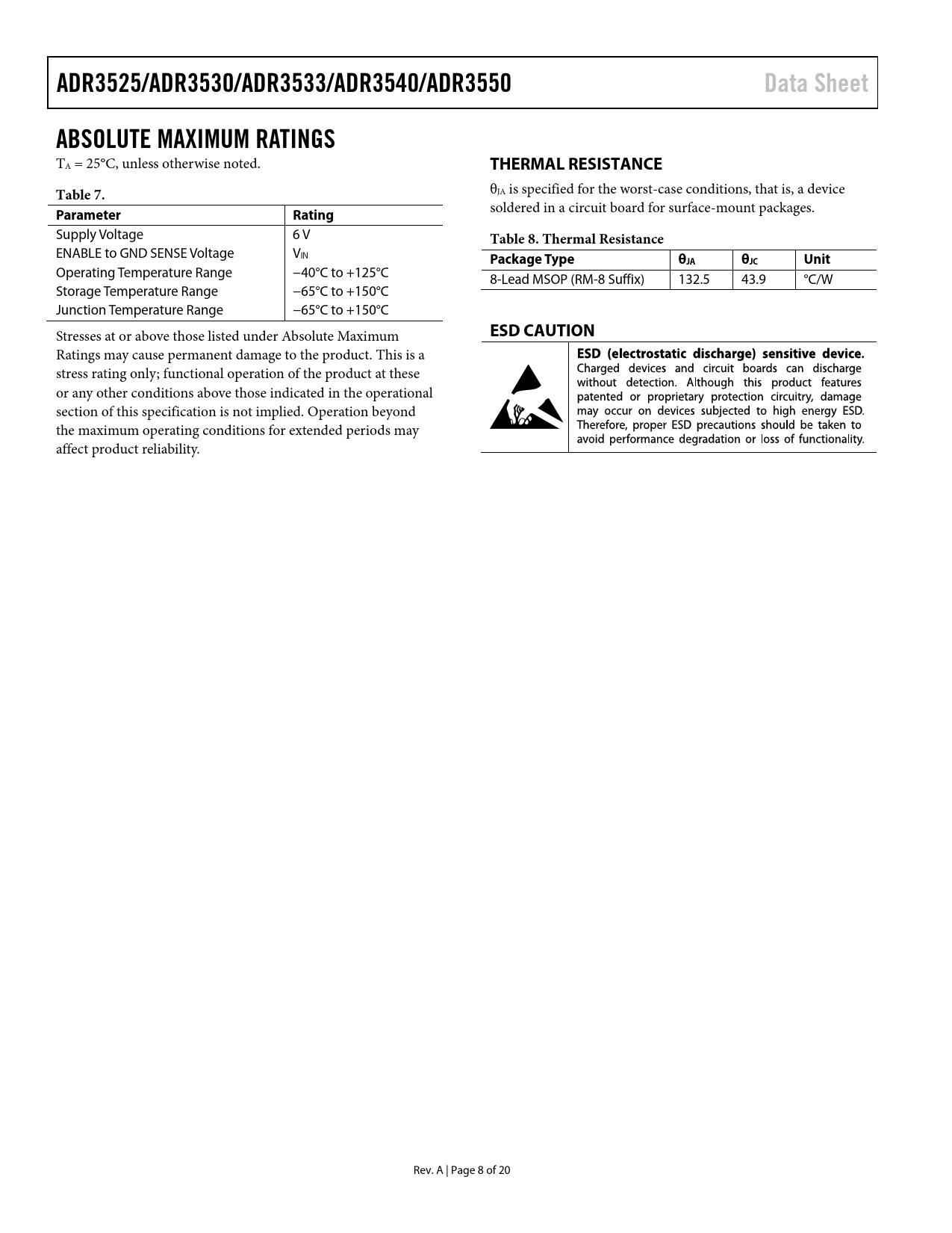 ADR3525/ADR3530/ADR3533/ADR3540/ADR3550. Data Sheet. ABSOLUTE MAXIMUM RATINGS. THERMAL RESISTANCE. Table 7. Parameter Rating