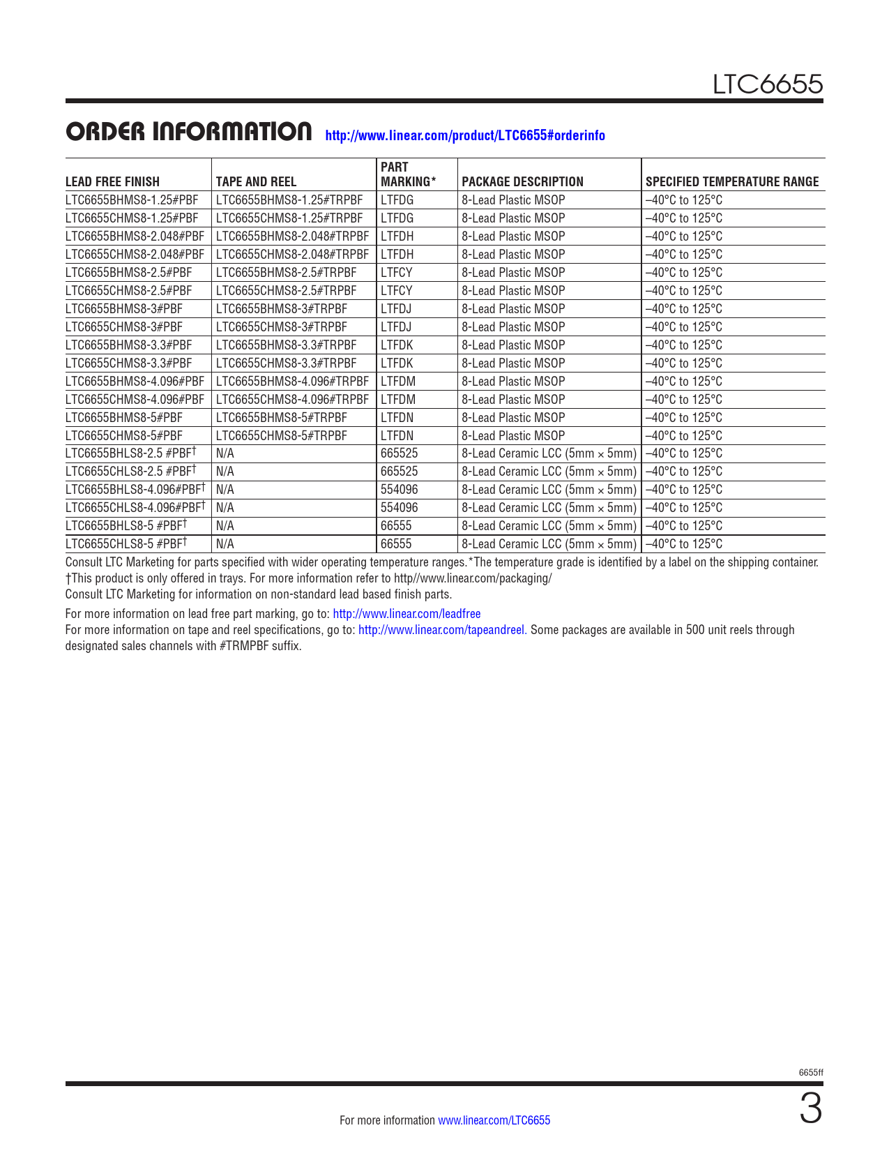 orDer inForMaTion http://www.linear.com/product/LTC6655#orderinfo PART LEAD FREE FINISH TAPE AND REEL MARKING* PACKAGE DESCRIPTION SPECIFIED TEMPERATURE RANGE