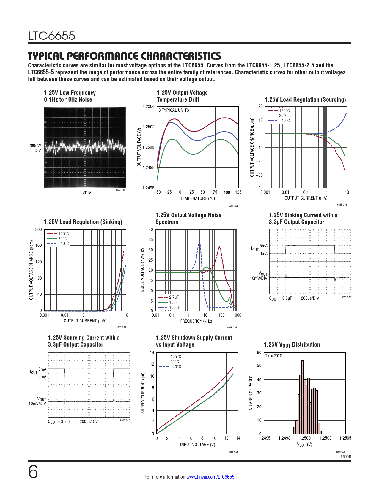 Typical perForMance characTerisTics Characteristic curves are similar for most voltage options of the LTC6655. Curves from the LTC6655-1.25, LTC6655-2.5 and the LTC6655-5 represent the range of performance across the entire family of references. Characteristic curves for other output voltages fall between these curves and can be estimated based on their voltage output. 1.25V Low Frequency 1.25V Output Voltage 0.1Hz to 10Hz Noise Temperature Drift 1.25V Load Regulation (Sourcing)