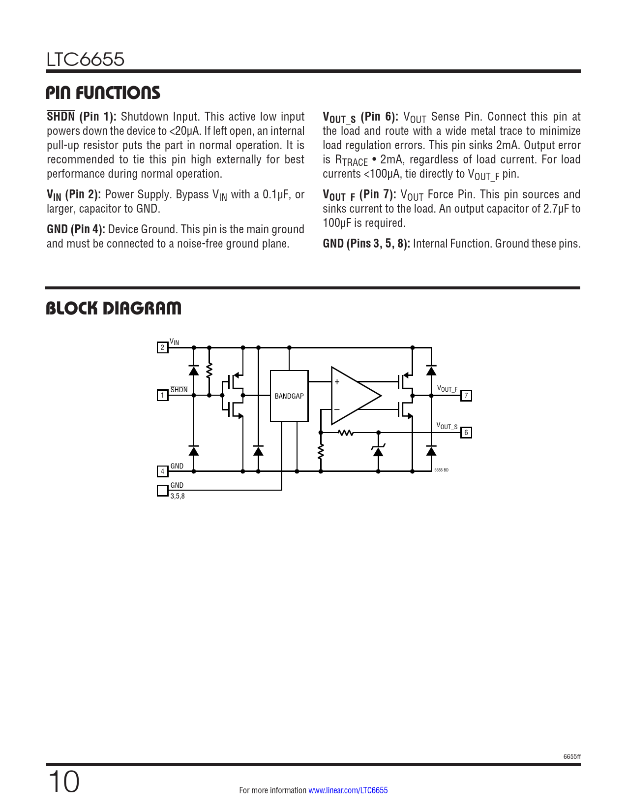 LTC6655 pin FuncTionsSHDN (Pin 1): Shutdown Input. This active low input VOUT_S (Pin 6): VOUT Sense Pin. Connect this pin at powers down the device to <20µA. If left open, an internal the load and route with a wide metal trace to minimize pull-up resistor puts the part in normal operation. It is load regulation errors. This pin sinks 2mA. Output error recommended to tie this pin high externally for best is RTRACE • 2mA, regardless of load current. For load performance during normal operation. currents <100µA, tie directly to VOUT_F pin. VIN (Pin 2): Power Supply. Bypass VIN with a 0.1µF, or VOUT_F (Pin 7): VOUT Force Pin. This pin sources and larger, capacitor to GND. sinks current to the load. An output capacitor of 2.7µF to GND (Pin 4): Device Ground. This pin is the main ground 100µF is required. and must be connected to a noise-free ground plane. GND (Pins 3, 5, 8): Internal Function. Ground these pins. block DiagraM VIN 2 + V SHDN OUT_F 1 BANDGAP 7 – VOUT_S 6 GND 6655 BD 4 GND 3,5,8 6655ff 10 For more information www.linear.com/LTC6655 Document Outline Features Applications Typical Application Description Absolute Maximum Ratings Pin Configuration Order Information Available Options Electrical Characteristics Pin Functions Block Diagram Applications Information Typical Applications Package Description Revision History Typical Application Related Parts