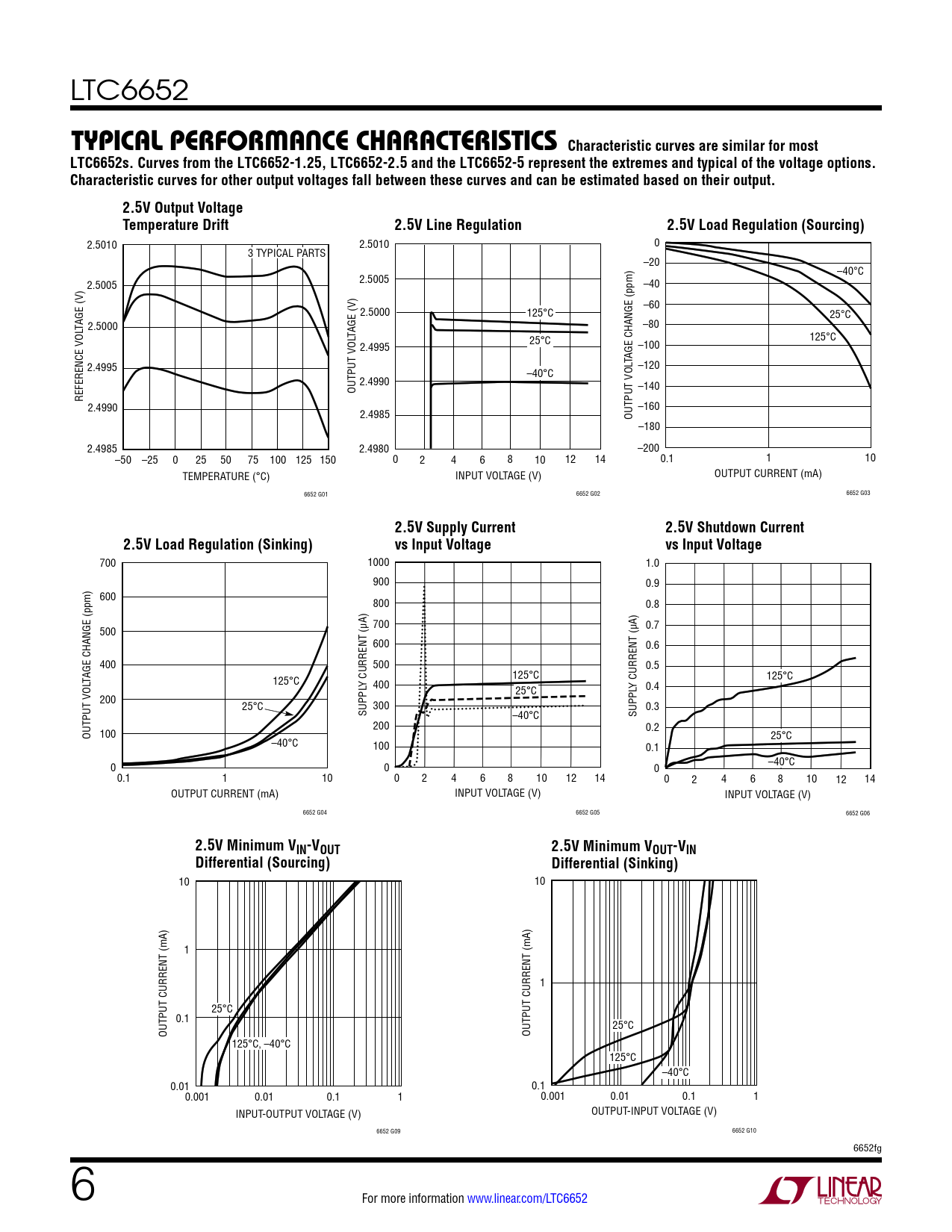 t ypical perForMance characteristics Characteristic curves are similar for most LTC6652s. Curves from the LTC6652-1.25, LTC6652-2.5 and the LTC6652-5 represent the extremes and typical of the voltage options. Characteristic curves for other output voltages fall between these curves and can be estimated based on their output. 2.5V Output Voltage Temperature Drift 2.5V Line Regulation 2.5V Load Regulation (Sourcing)