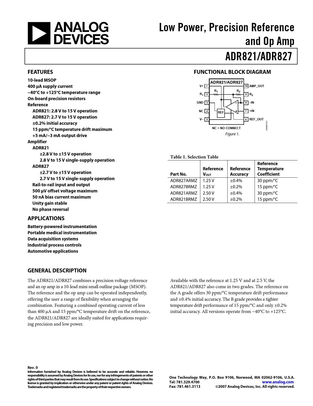 Low Power, Precision Reference. and Op Amp. ADR821/ADR827. FEATURES. FUNCTIONAL BLOCK DIAGRAM. 10-lead MSOP. 400 μA supply current