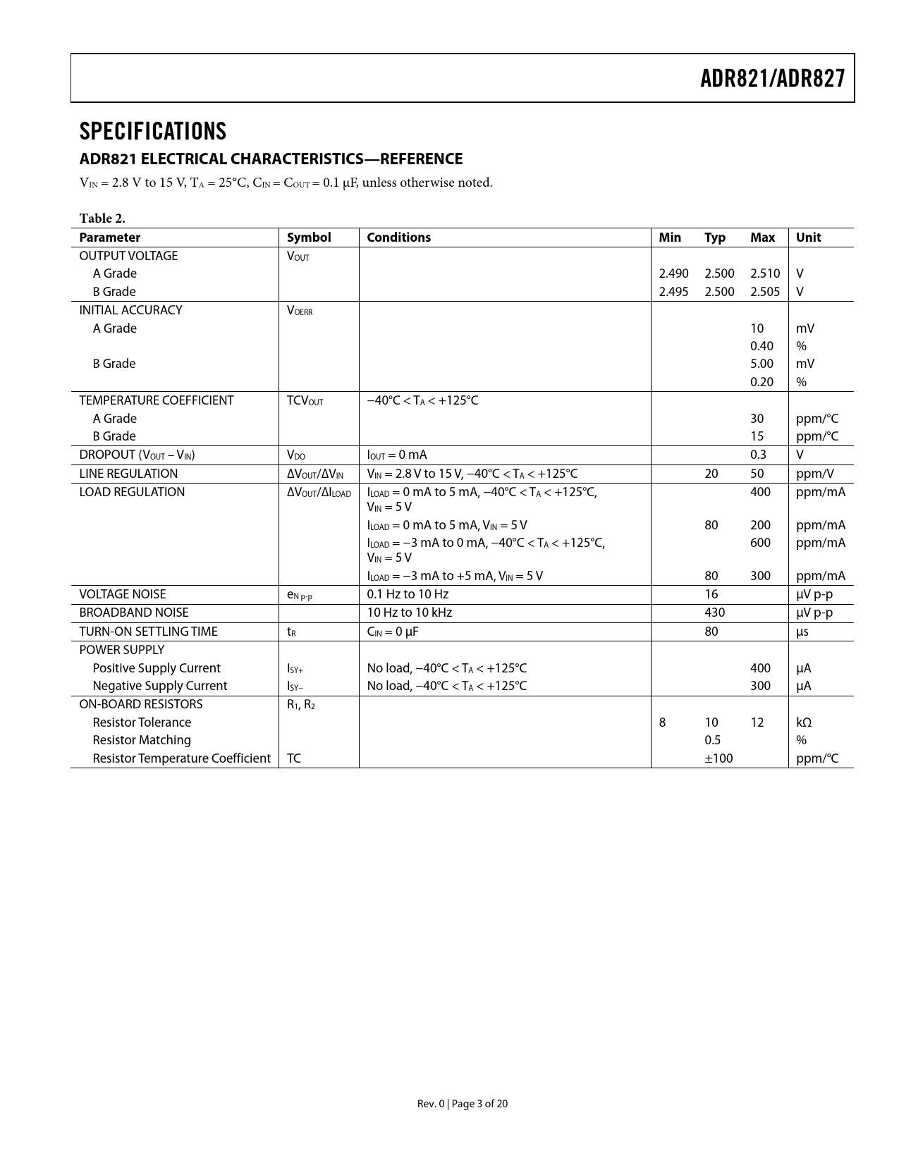 ADR821/ADR827. SPECIFICATIONS ADR821 ELECTRICAL CHARACTERISTICS—REFERENCE. Table 2. Parameter Symbol. Conditions. Min. Typ. Max. Unit