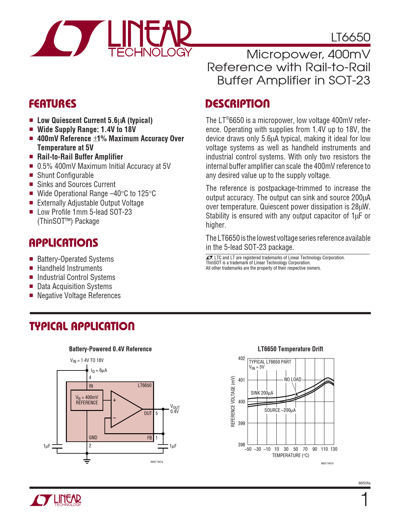 The LT6650 is the lowest voltage series reference available in the 5-lead SOT-23 package. ■ Battery-Operated Systems , LTC and LT are registered trademarks of Linear Technology Corporation. ThinSOT is a trademark of Linear Technology Corporation. ■ Handheld Instruments All other trademarks are the property of their respective owners. ■ Industrial Control Systems ■ Data Acquisition Systems ■ Negative Voltage References