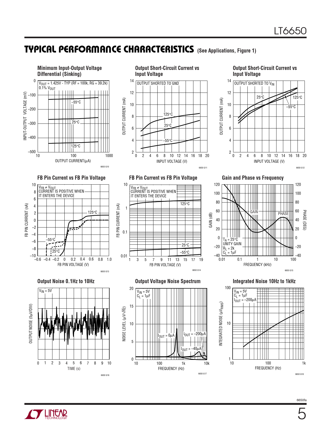 20 100 VIN = 5V VIN = 5V VIN = 5V CL = 1µF CL = 1µF ) IOUT = –200µA 15 RMS µV/DIV) √Hz) µV µV/ 10 10 I I OUT = 0µA OUT = –200µA NOISE LEVEL ( OUTPUT NOISE (5 5 INTEGRATED NOISE ( IOUT = –40µA 0 1 0 1 2 3 4 5 6 7 8 9 10 10 100 1k 10k 10 100 1k TIME (s) FREQUENCY (Hz) FREQUENCY (Hz) 6650 G17 6650 G16 6650 G18 6650fa 5