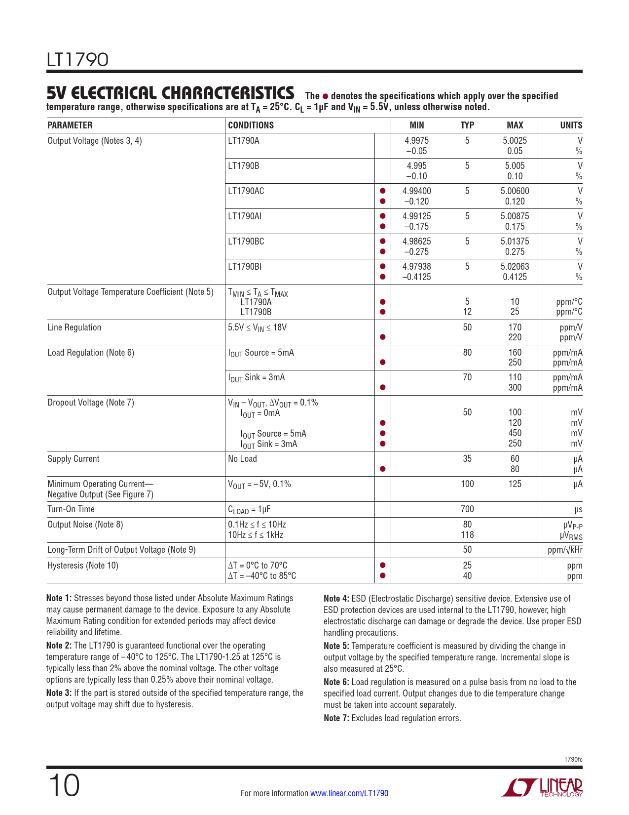 Output Voltage (Notes 3, 4) LT1790A 4.9975 5 5.0025 V –0.05 0.05 % LT1790B 4.995 5 5.005 V –0.10 0.10 % LT1790AC l 4.99400 5 5.00600 V l –0.120 0.120 % LT1790AI l 4.99125 5 5.00875 V l –0.175 0.175 % LT1790BC l 4.98625 5 5.01375 V l –0.275 0.275 % LT1790BI l 4.97938 5 5.02063 V l –0.4125 0.4125 % Output Voltage Temperature Coefficient (Note 5) TMIN ≤ TA ≤ TMAX LT1790A l 5 10 ppm/°C LT1790B l 12 25 ppm/°C Line Regulation 5.5V ≤ VIN ≤ 18V 50 170 ppm/V l 220 ppm/V Load Regulation (Note 6) IOUT Source = 5mA 80 160 ppm/mA l 250 ppm/mA IOUT Sink = 3mA 70 110 ppm/mA l 300 ppm/mA Dropout Voltage (Note 7) VIN – VOUT, ∆VOUT = 0.1% IOUT = 0mA 50 100 mV l 120 mV IOUT Source = 5mA l 450 mV IOUT Sink = 3mA l 250 mV Supply Current No Load 35 60 µA l 80 µA Minimum Operating Current— VOUT = –5V, 0.1% 100 125 µA Negative Output (See Figure 7) Turn-On Time CLOAD = 1µF 700 µs Output Noise (Note 8) 0.1Hz ≤ f ≤ 10Hz 80 µVP-P 10Hz ≤ f ≤ 1kHz 118 µVRMS Long-Term Drift of Output Voltage (Note 9) 50 ppm/√kHr Hysteresis (Note 10) ∆T = 0°C to 70°C l 25 ppm ∆T = –40°C to 85°C l 40 ppm