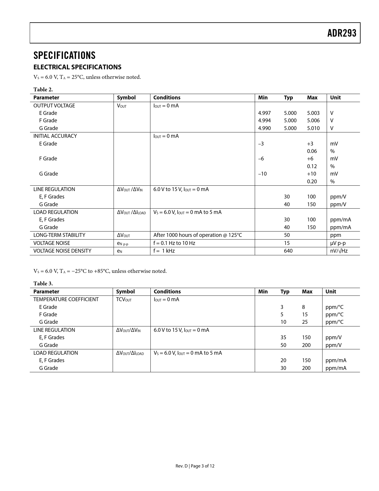 ADR293 SPECIFICATIONS ELECTRICAL SPECIFICATIONS Table 2 Parameter Symbol Conditions Min Typ Max Unit Table 3 Parameter