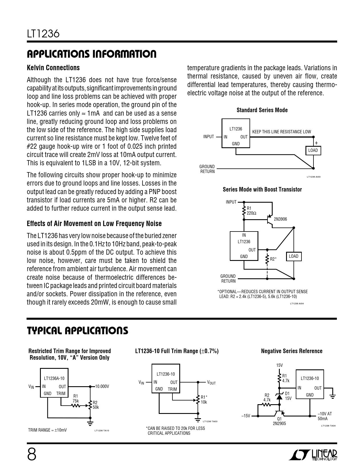 line, greatly reducing ground loop and loss problems on the low side of the reference. The high side supplies load LT1236 KEEP THIS LINE RESISTANCE LOW current so line resistance must be kept low. Twelve feet of INPUT IN OUT + #22 gauge hook-up wire or 1 foot of 0.025 inch printed GND LOAD circuit trace will create 2mV loss at 10mA output current. This is equivalent to 1LSB in a 10V, 12-bit system. GROUND RETURN The following circuits show proper hook-up to minimize LT1236 AI03 errors due to ground loops and line losses. Losses in the output lead can be greatly reduced by adding a PNP boost