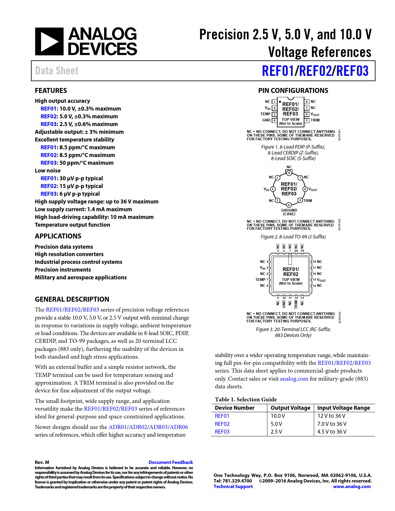 Precision 2.5 V, 5.0 V, and 10.0 V. Voltage References. Data Sheet. REF01. /REF02. /REF03. FEATURES. PIN CONFIGURATIONS