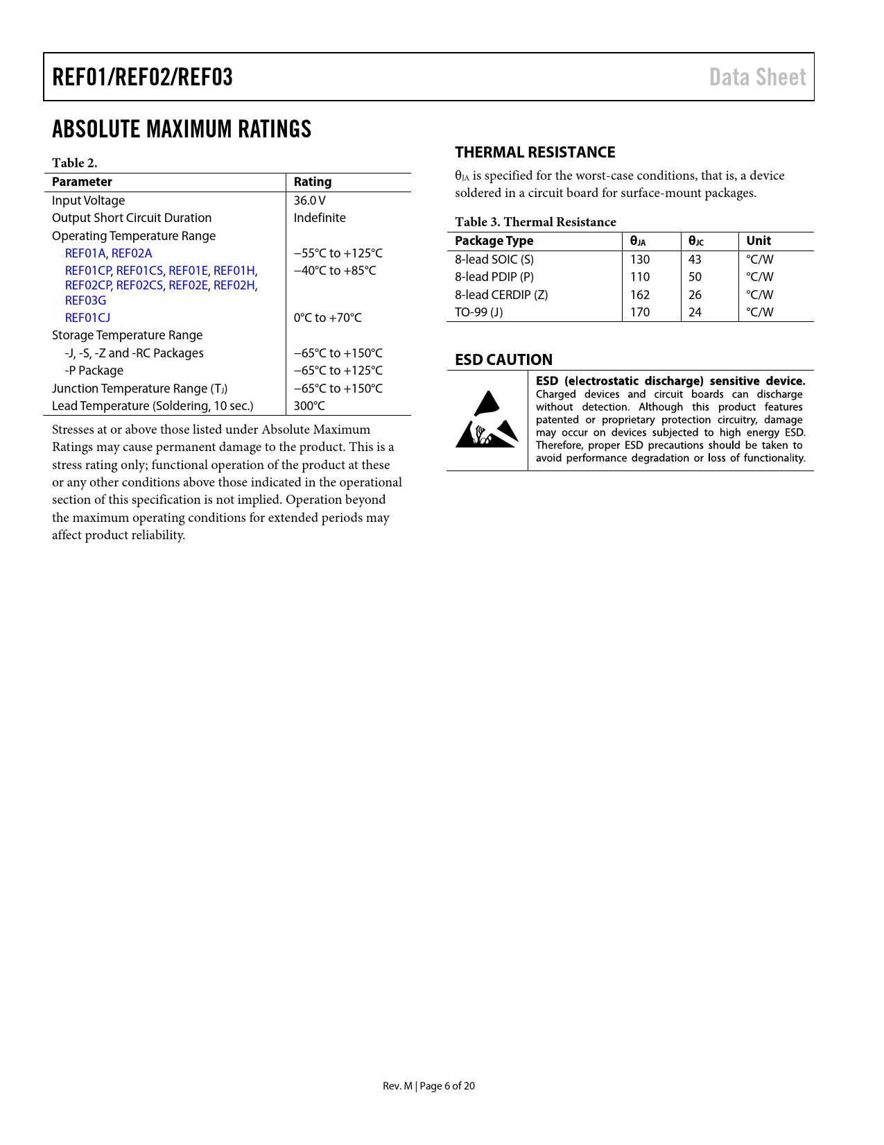 REF01/REF02/REF03. Data Sheet. ABSOLUTE MAXIMUM RATINGS. THERMAL RESISTANCE. Table 2. Parameter. Rating