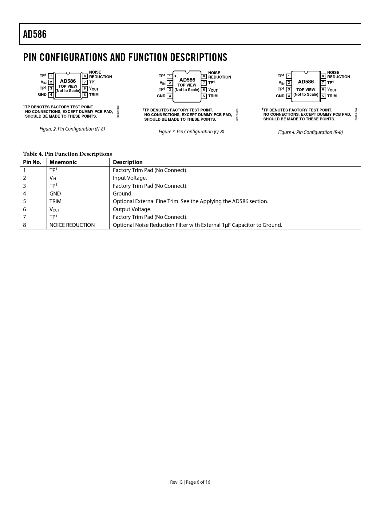 AD586. PIN CONFIGURATIONS AND FUNCTION DESCRIPTIONS. NOISE. TP1. REDUCTION. VIN 2. TOP VIEW. VOUT. (Not to Scale). GND. TRIM