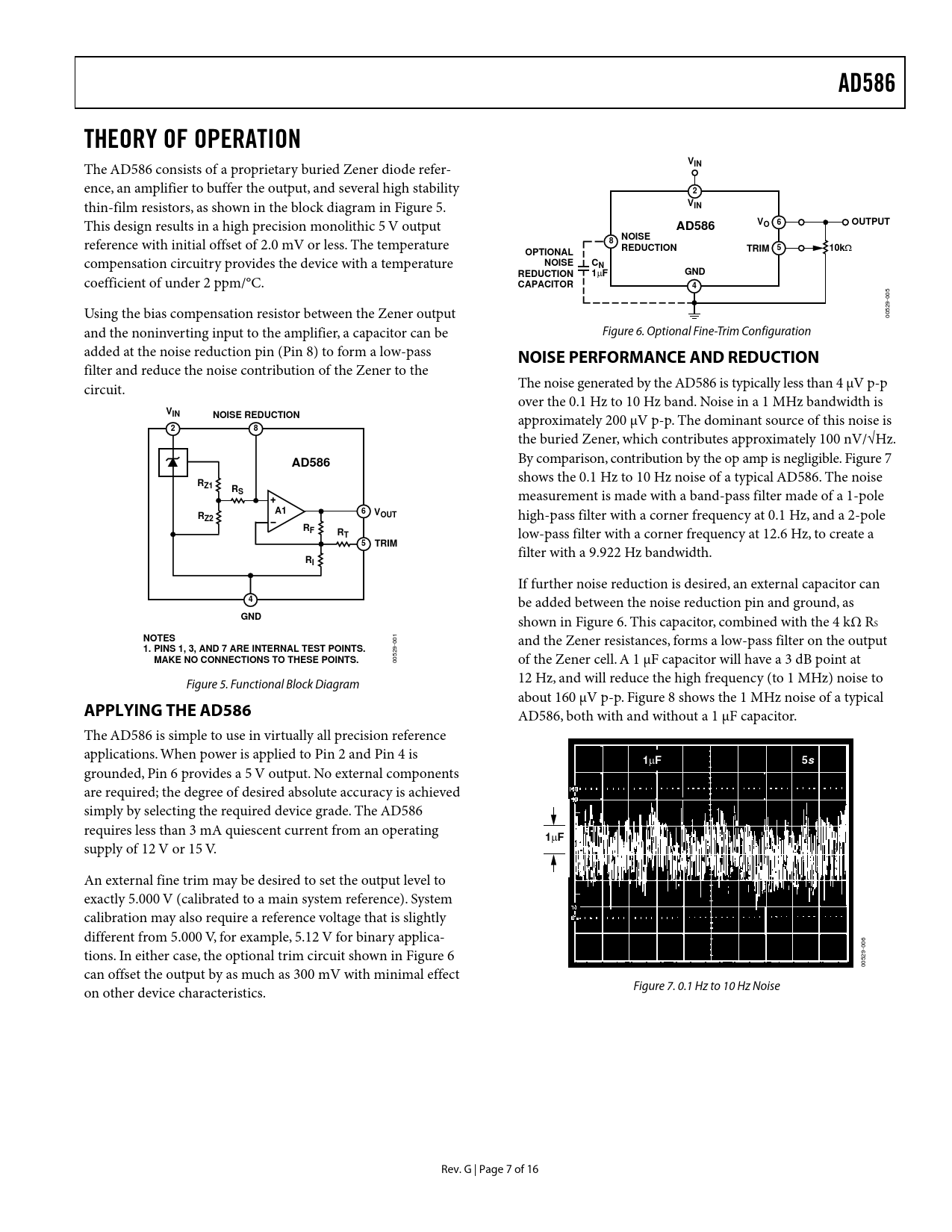 AD586. THEORY OF OPERATION. VIN. VO 6. OUTPUT. NOISE. REDUCTION. TRIM 5. 10k. OPTIONAL. GND. CAPACITOR. NOISE PERFORMANCE AND REDUCTION