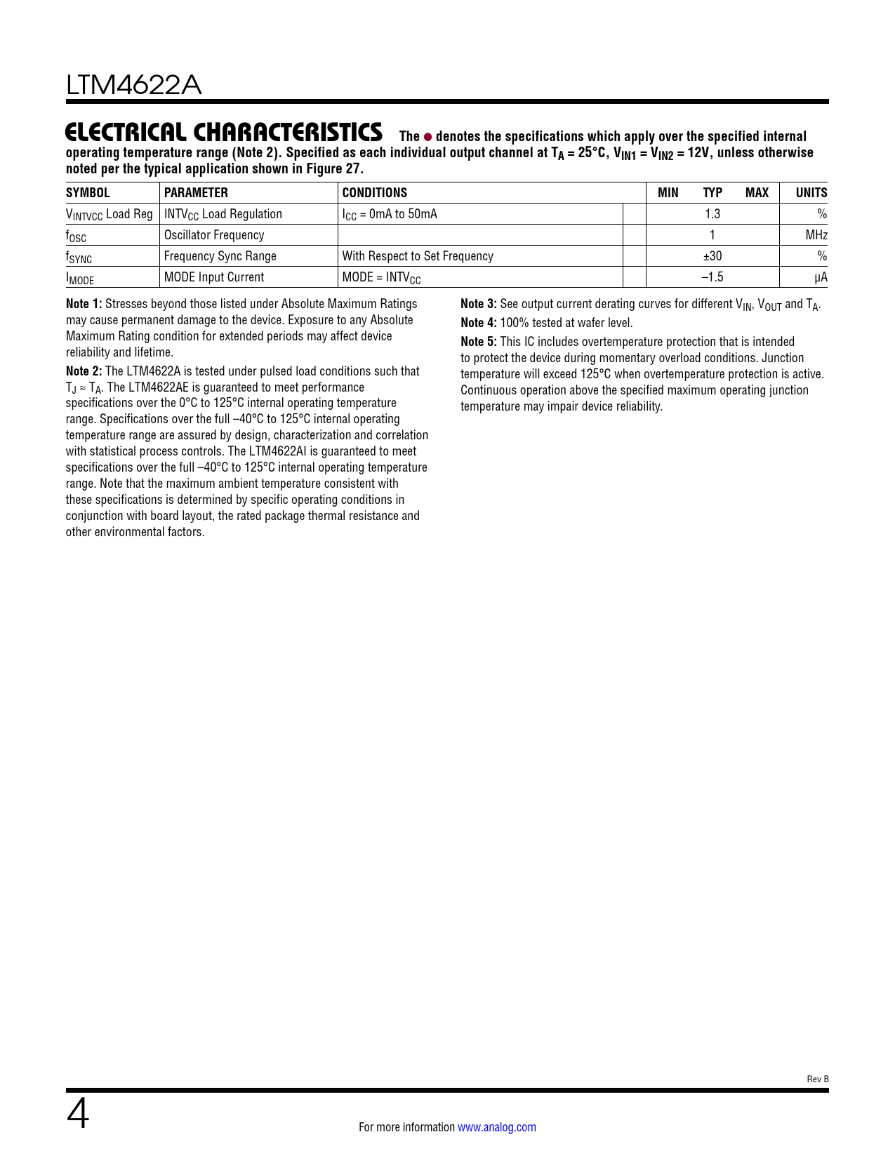 link to page 24 LTM4622A ELECTRICAL CHARACTERISTICSThe l denotes the specifications which apply over the specified internaloperating temperature range (Note 2). Specified as each individual output channel at TA = 25°C, VIN1 = VIN2 = 12V, unless otherwisenoted per the typical application shown in Figure 27.SYMBOLPARAMETERCONDITIONSMINTYPMAXUNITS VINTVCC Load Reg INTVCC Load Regulation ICC = 0mA to 50mA 1.3 % fOSC Oscillator Frequency 1 MHz fSYNC Frequency Sync Range With Respect to Set Frequency ±30 % IMODE MODE Input Current MODE = INTVCC –1.5 µA Note 1: Stresses beyond those listed under Absolute Maximum Ratings Note 3: See output current derating curves for different VIN, VOUT and TA. may cause permanent damage to the device. Exposure to any Absolute Note 4: 100% tested at wafer level. Maximum Rating condition for extended periods may affect device Note 5: This IC includes overtemperature protection that is intended reliability and lifetime. to protect the device during momentary overload conditions. Junction Note 2: The LTM4622A is tested under pulsed load conditions such that temperature will exceed 125°C when overtemperature protection is active. TJ ≈ TA. The LTM4622AE is guaranteed to meet performance Continuous operation above the specified maximum operating junction specifications over the 0°C to 125°C internal operating temperature temperature may impair device reliability. range. Specifications over the full –40°C to 125°C internal operating temperature range are assured by design, characterization and correlation with statistical process controls. The LTM4622AI is guaranteed to meet specifications over the full –40°C to 125°C internal operating temperature range. Note that the maximum ambient temperature consistent with these specifications is determined by specific operating conditions in conjunction with board layout, the rated package thermal resistance and other environmental factors. Rev B 4 For more information www.analog.com Document Outline Features Applications Typical Application Description Absolute Maximum Ratings Pin Configuration Order Information Electrical Characteristics Typical Performance Characteristics Pin Functions Block Diagram Decoupling Requirements Operation Applications Information Safety Considerations Layout Checklist/Example Package Description Package Photos Design Resources Related Parts