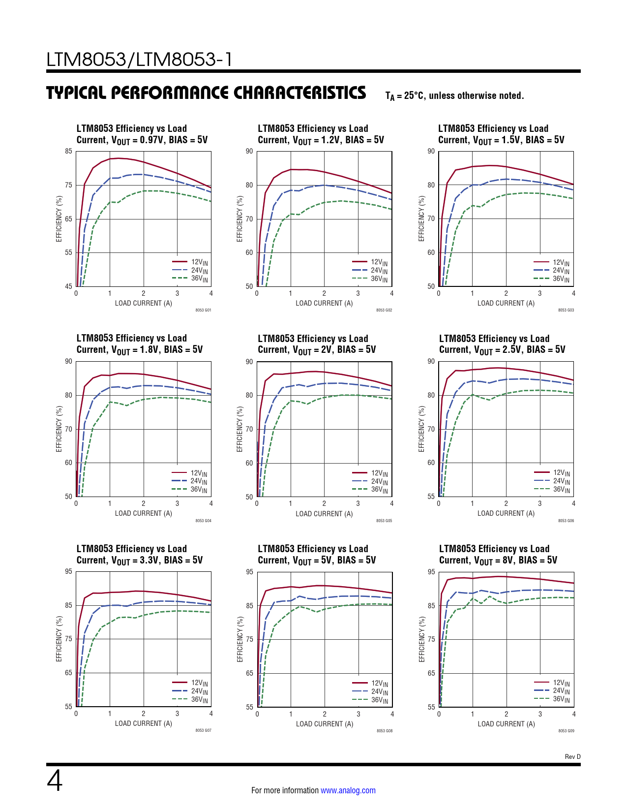 85 90 90 75 80 80 65 70 70 EFFICIENCY (%) EFFICIENCY (%) EFFICIENCY (%) 55 60 60 12VIN 12VIN 12VIN 24VIN 24VIN 24VIN 36VIN 36VIN 36VIN 45 50 50 0 1 2 3 4 0 1 2 3 4 0 1 2 3 4 LOAD CURRENT (A) LOAD CURRENT (A) LOAD CURRENT (A) 8053 G01 8053 G02 8053 G03
