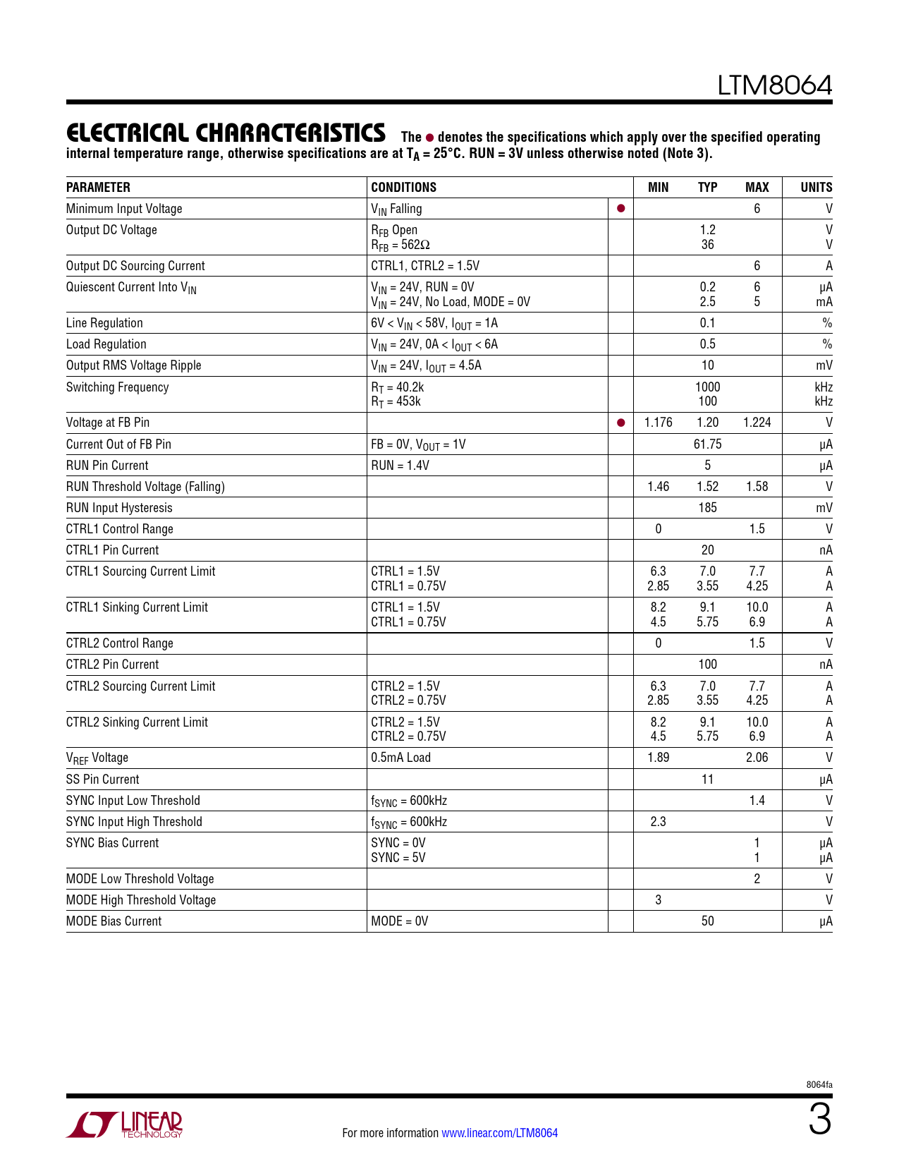 Minimum Input Voltage VIN Falling l 6 V Output DC Voltage RFB Open 1.2 V RFB = 562Ω 36 V Output DC Sourcing Current CTRL1, CTRL2 = 1.5V 6 A Quiescent Current Into VIN VIN = 24V, RUN = 0V 0.2 6 µA VIN = 24V, No Load, MODE = 0V 2.5 5 mA Line Regulation 6V < VIN < 58V, IOUT = 1A 0.1 % Load Regulation VIN = 24V, 0A < IOUT < 6A 0.5 % Output RMS Voltage Ripple VIN = 24V, IOUT = 4.5A 10 mV Switching Frequency RT = 40.2k 1000 kHz RT = 453k 100 kHz Voltage at FB Pin l 1.176 1.20 1.224 V Current Out of FB Pin FB = 0V, VOUT = 1V 61.75 µA RUN Pin Current RUN = 1.4V 5 µA RUN Threshold Voltage (Falling) 1.46 1.52 1.58 V RUN Input Hysteresis 185 mV CTRL1 Control Range 0 1.5 V CTRL1 Pin Current 20 nA CTRL1 Sourcing Current Limit CTRL1 = 1.5V 6.3 7.0 7.7 A CTRL1 = 0.75V 2.85 3.55 4.25 A CTRL1 Sinking Current Limit CTRL1 = 1.5V 8.2 9.1 10.0 A CTRL1 = 0.75V 4.5 5.75 6.9 A CTRL2 Control Range 0 1.5 V CTRL2 Pin Current 100 nA CTRL2 Sourcing Current Limit CTRL2 = 1.5V 6.3 7.0 7.7 A CTRL2 = 0.75V 2.85 3.55 4.25 A CTRL2 Sinking Current Limit CTRL2 = 1.5V 8.2 9.1 10.0 A CTRL2 = 0.75V 4.5 5.75 6.9 A VREF Voltage 0.5mA Load 1.89 2.06 V SS Pin Current 11 µA SYNC Input Low Threshold fSYNC = 600kHz 1.4 V SYNC Input High Threshold fSYNC = 600kHz 2.3 V SYNC Bias Current SYNC = 0V 1 µA SYNC = 5V 1 µA MODE Low Threshold Voltage 2 V MODE High Threshold Voltage 3 V MODE Bias Current MODE = 0V 50 µA 8064fa For more information www.linear.com/LTM8064 3 Document Outline Features Description Applications Typical Application Absolute Maximum Ratings Pin Configuration Order Information Electrical Characteristics Typical Performance Characteristics Pin Functions Block Diagram Operation Applications Information Typical Applications Package Description Revision History Typical Application Related Parts