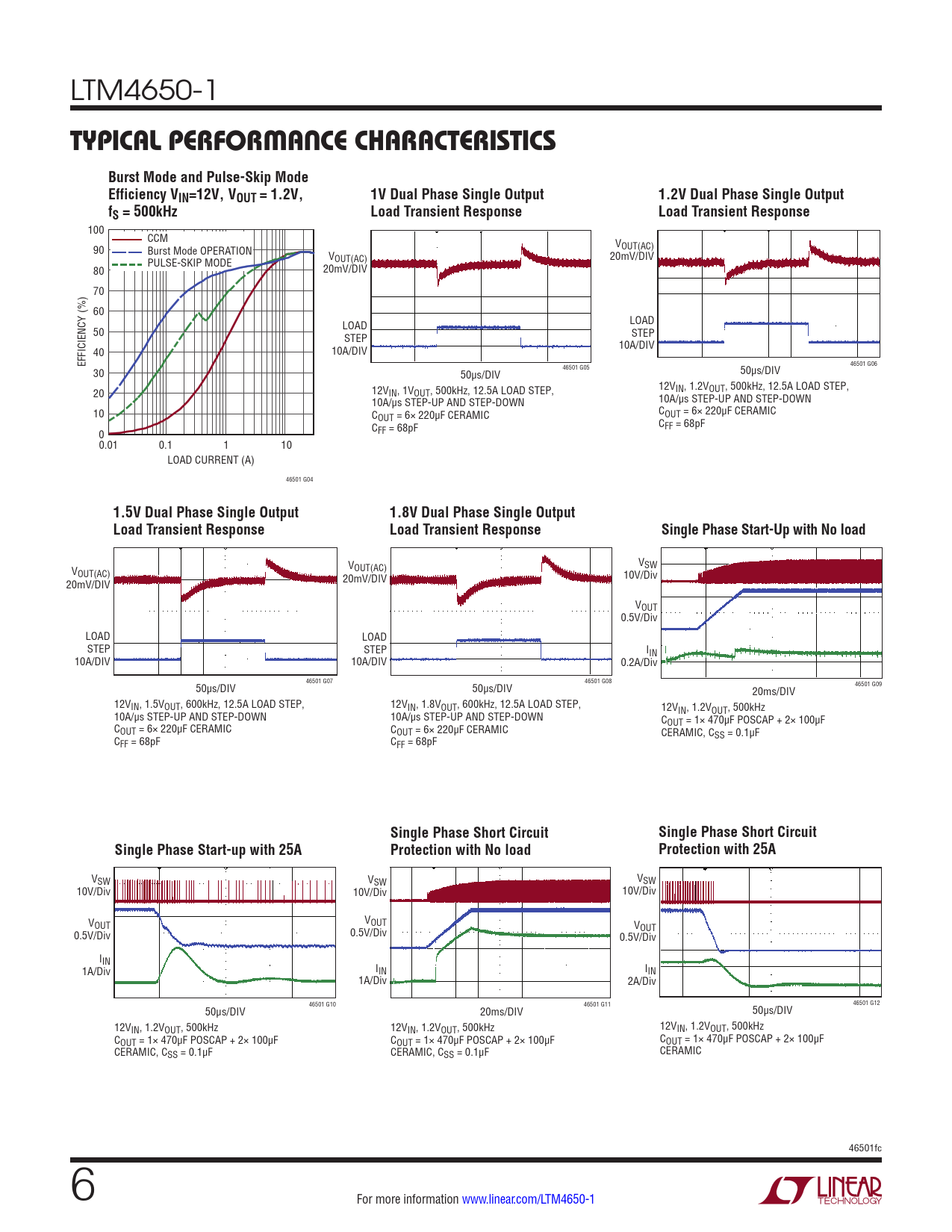 V V SW V OUT(AC) OUT(AC) 10V/Div 20mV/DIV 20mV/DIV VOUT 0.5V/Div LOAD LOAD STEP STEP IIN 10A/DIV 10A/DIV 0.2A/Div 46501 G07 46501 G08 46501 G09 50µs/DIV 50µs/DIV 20ms/DIV 12VIN, 1.5VOUT, 600kHz, 12.5A LOAD STEP, 12VIN, 1.8VOUT, 600kHz, 12.5A LOAD STEP, 12VIN, 1.2VOUT, 500kHz 10A/µs STEP-UP AND STEP-DOWN 10A/µs STEP-UP AND STEP-DOWN COUT = 1× 470µF POSCAP + 2× 100µF COUT = 6× 220µF CERAMIC COUT = 6× 220µF CERAMIC CERAMIC, CSS = 0.1µF CFF = 68pF CFF = 68pF