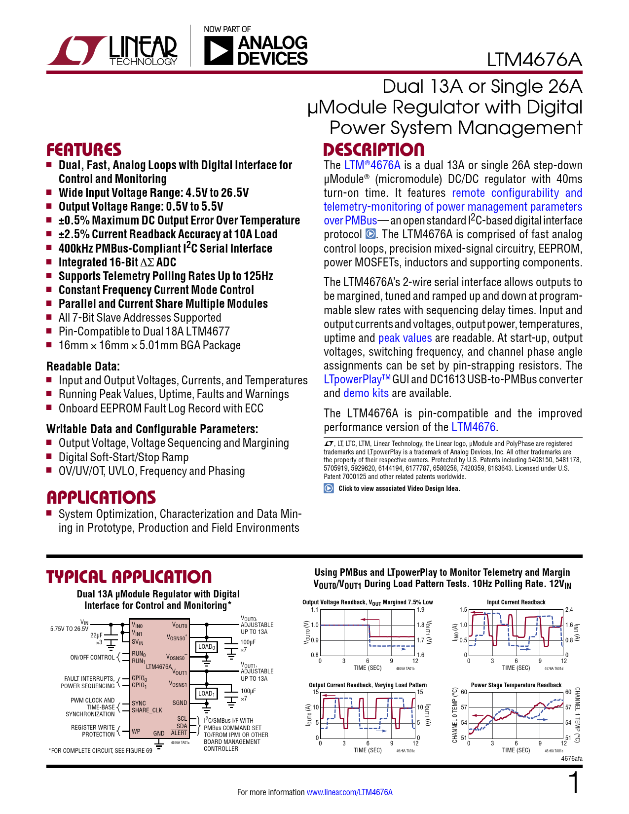 link to page 26 LTM4676A Dual 13A or Single 26A µModule Regulator with Digital Power System Management FeaTuresDescripTion n Dual, Fast, Analog Loops with Digital Interface for The LTM®4676A is a dual 13A or single 26A step-down Control and Monitoring µModule® (micromodule) DC/DC regulator with 40ms n Wide Input Voltage Range: 4.5V to 26.5V turn-on time. It features remote configurability and n Output Voltage Range: 0.5V to 5.5V telemetry-monitoring of power management parameters n ±0.5% Maximum DC Output Error Over Temperature over PMBus— an open standard I2C-based digital interface n ±2.5% Current Readback Accuracy at 10A Load protocol . The LTM4676A is comprised of fast analog n 400kHz PMBus-Compliant I2C Serial Interface control loops, precision mixed-signal circuitry, EEPROM, n Integrated 16-Bit ∆Σ ADC power MOSFETs, inductors and supporting components. n Supports Telemetry Polling Rates Up to 125Hz The LTM4676A’s 2-wire serial interface al ows outputs to n Constant Frequency Current Mode Control be margined, tuned and ramped up and down at program- n Parallel and Current Share Multiple Modules mable slew rates with sequencing delay times. Input and n All 7-Bit Slave Addresses Supported output currents and voltages, output power, temperatures, n Pin-Compatible to Dual 18A LTM4677 uptime and peak values are readable. At start-up, output n 16mm × 16mm × 5.01mm BGA Package voltages, switching frequency, and channel phase angle Readable Data: assignments can be set by pin-strapping resistors. The n Input and Output Voltages, Currents, and Temperatures LTpowerPlay™ GUI and DC1613 USB-to-PMBus converter n Running Peak Values, Uptime, Faults and Warnings and demo kits are available. n Onboard EEPROM Fault Log Record with ECC The LTM4676A is pin-compatible and the improved Writable Data and Configurable Parameters: performance version of the LTM4676. n Output Voltage, Voltage Sequencing and Margining L, LT, LTC, LTM, Linear Technology, the Linear logo, µModule and PolyPhase are registered trademarks and LTpowerPlay is a trademark of Analog Devices, Inc. All other trademarks are n Digital Soft-Start/Stop Ramp the property of their respective owners. Protected by U.S. Patents including 5408150, 5481178, n OV/UV/OT, UVLO, Frequency and Phasing 5705919, 5929620, 6144194, 6177787, 6580258, 7420359, 8163643. Licensed under U.S. Patent 7000125 and other related patents worldwide. applicaTionsClick to view associated Video Design Idea. n System Optimization, Characterization and Data Min- ing in Prototype, Production and Field Environments Typical applicaTionUsing PMBus and LTpowerPlay to Monitor Telemetry and MarginVOUT0/VOUT1 During Load Pattern Tests. 10Hz Polling Rate. 12VINDual 13A µModule Regulator with DigitalInterface for Control and Monitoring*Output Voltage Readback, VOUT Margined 7.5% LowInput Current Readback 1.1 1.9 1.5 2.4 V V OUT0, V IN V OUT1 I IN0 VOUT0 ADJUSTABLE 1.0 1.8 1.0 IN1 1.6 5.75V TO 26.5V (V) (A) (A) 22µF V UP TO 13A IN1 V + (V) OSNS0 ×3 SV 0.9 1.7 I IN0 0.5 0.8 IN 100µF V OUT0 LOAD0 ×7 ON/OFF CONTROL RUN0 V – OSNS0 0.8 1.6 0 0 RUN1 V 0 3 6 9 12 0 3 6 9 12 LTM4676A OUT1, V TIME (SEC) 4676A TA01b TIME (SEC) 4676A TA01d OUT1 ADJUSTABLE FAULT INTERRUPTS, GPIO0 UP TO 13A POWER SEQUENCING V GPIO OSNS1 1 Output Current Readback, Varying Load PatternPower Stage Temperature Readback CHANNEL 1 TEMP (°C) 100µF LOAD1 15 15 60 60 PWM CLOCK AND ×7 SYNC SGND I TIME-BASE OUT1 SHARE_CLK 10 10 57 57 SYNCHRONIZATION (A) SCL (A) I2C/SMBus I/F WITH SDA I OUT0 5 5 54 54 REGISTER WRITE PMBus COMMAND SET WP PROTECTION GND ALERT TO/FROM IPMI OR OTHER 0 0 51 51 4676A TA01a BOARD MANAGEMENT 0 3 6 9 12 CHANNEL 0 TEMP (°C) 0 3 6 9 12 CONTROLLER *FOR COMPLETE CIRCUIT, SEE FIGURE 69 TIME (SEC) 4676A TA01c TIME (SEC) 4676A TA01e 4676afa For more information www.linear.com/LTM4676A 1 Document Outline Features Applications Typical Application Description Absolute Maximum Ratings Order Information Pin Configuration Electrical Characteristics Typical Performance Characteristics Pin Functions Simplified Block Diagram Decoupling Requirements Functional Diagram Test Circuits Operation Power Module Introduction Power Module Configurability and Readback Data Time-Averaged and Peak Readback Data Power Module Overview EEPROM Serial Interface Device Addressing Fault Detection and Handling Responses to VOUT and IOUT Faults Responses to Timing Faults Responses to SVIN OV Faults Responses to OT/UT Faults Responses to External Faults Fault Logging Bus Timeout Protection PMBus Command Summary PMBus Commands VIN to VOUT Step-Down Ratios Input Capacitors Output Capacitors Light Load Current Operation Switching Frequency and Phase Minimum On-Time Considerations Variable Delay Time, Soft-Start and Output Voltage Ramping Digital Servo Mode Soft Off (Sequenced Off) Undervoltage Lockout Fault Detection and Handling Open-Drain Pins Phase-Locked Loop and Frequency Synchronization RCONFIG Pin-Straps (External Resistor Configuration Pins) Voltage Selection Connecting the USB to the I2C/SMBus/PMBus Controller to the LTM4676A In System LTpowerPlay: An Interactive GUI for Digital Power System Management PMBus Communication and Command Processing Thermal Considerations and Output Current Derating EMI Performance Safety Considerations Layout Checklist/Example Typical Applications Appendix A Similarity Between PMBus, SMBus and I2C 2-Wire Interface Appendix B PMBus Serial Digital Interface Appendix C: PMBus Command Details Addressing and Write Protect General Configuration Registers On/Off/Margin PWM Config Voltage Current Temperature Timing Fault Response Fault Sharing Scratchpad Identification Fault Warning and Status Telemetry NVM (EEPROM) Memory Commands Package Description Package Photograph Package Description Revision History Typical Application Design Resources Related Parts
