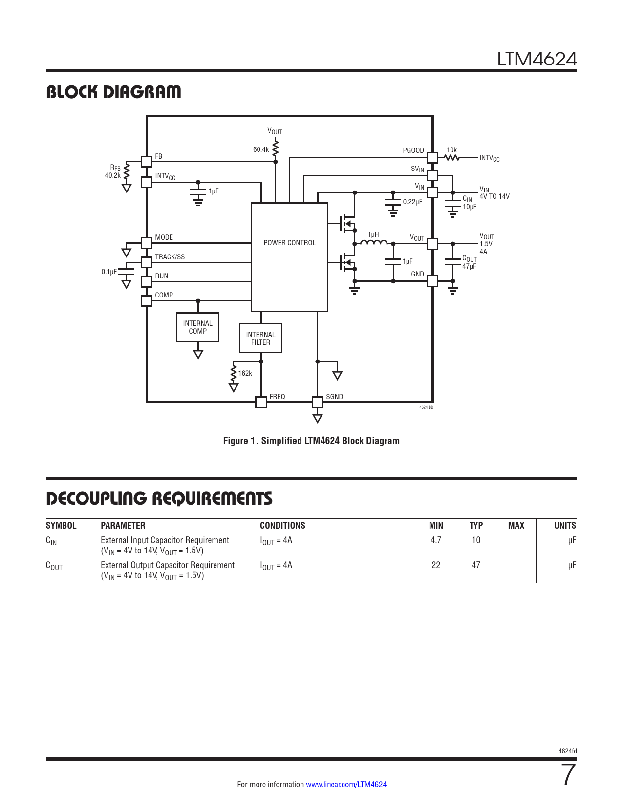 BLOCK DIAGRAM. Figure 1. Simplified LTM4624 Block Diagram. DECOUPLING REQUIREMENTS SYMBOL. PARAMETER. CONDITIONS. MIN. TYP. MAX. UNITS